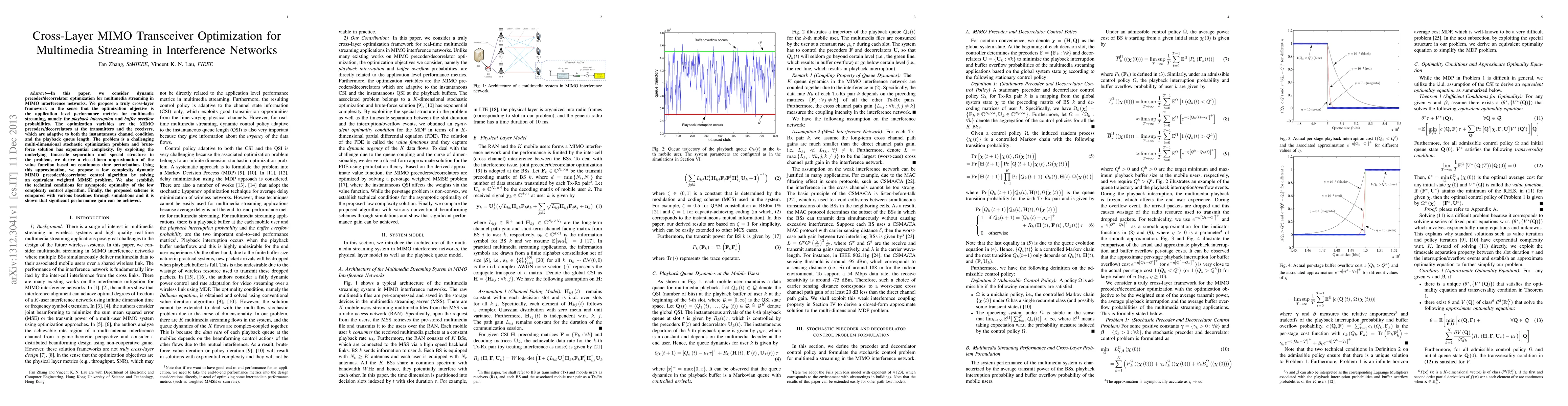 This paper proposes a cross-layer optimization framework for dynamic precoder/decorrelator control in MIMO interference networks to enhance multimedia streaming, focusing on reducing playback interruptions and buffer overflows. It introduces a low complexity algorithm based on continuous time perturbation, achieving significant performance gains over baselines as demonstrated by simulations.