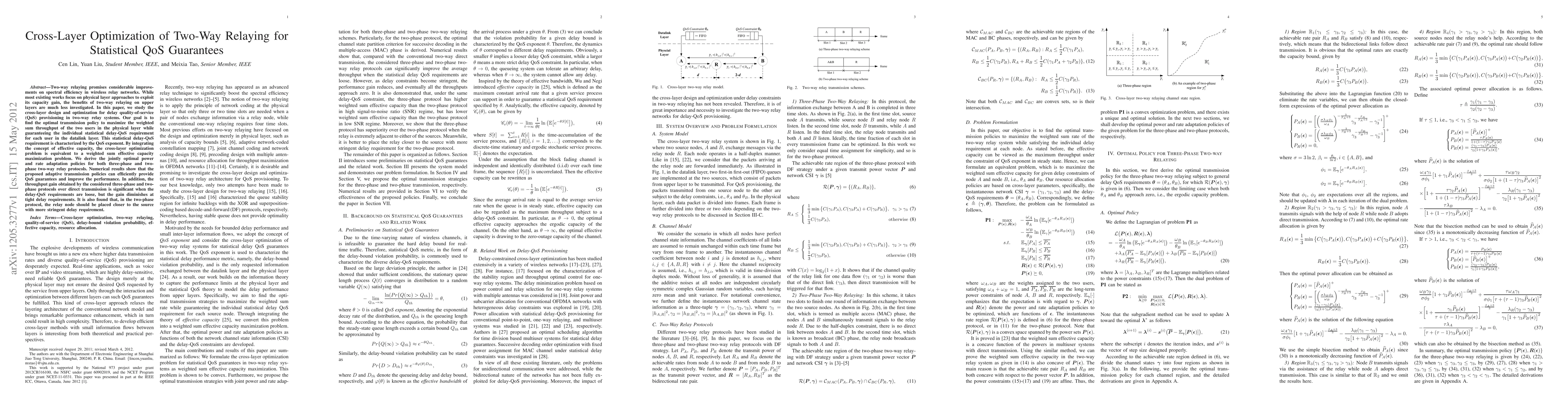The paper studies cross-layer optimization of two-way relaying for statistical QoS guarantees, focusing on three-phase and two-phase transmission protocols. It models the optimization problem as maximizing long-term weighted sum effective capacity, integrating effective capacity theory.