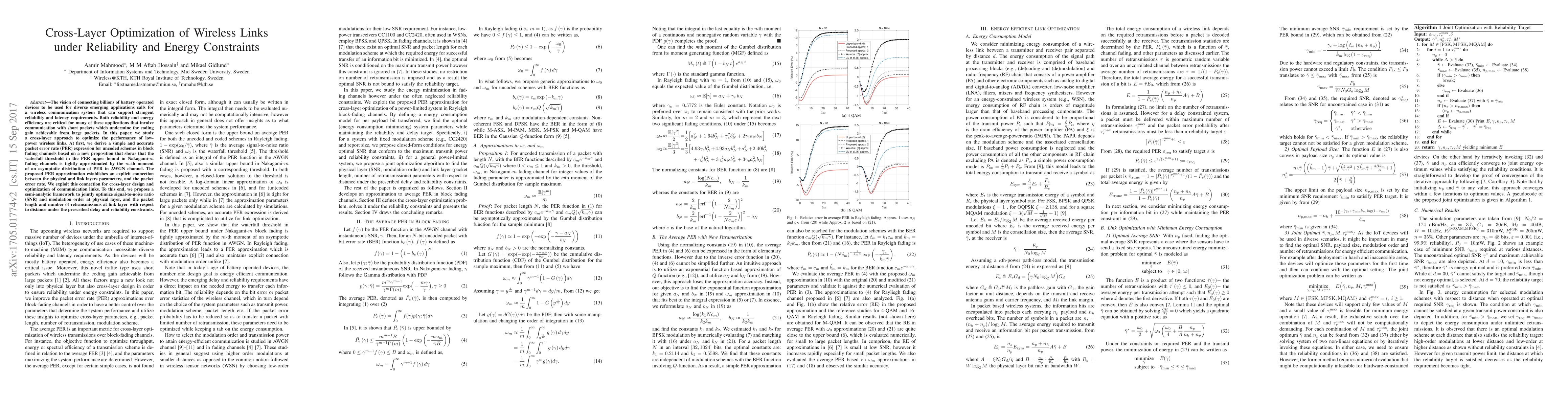 This paper proposes a cross-layer optimization framework to enhance the performance of low-power wireless links under reliability and energy constraints, deriving a new PER approximation for uncoded schemes in block fading channels and optimizing SNR, modulation order, packet length, and retransmissions.