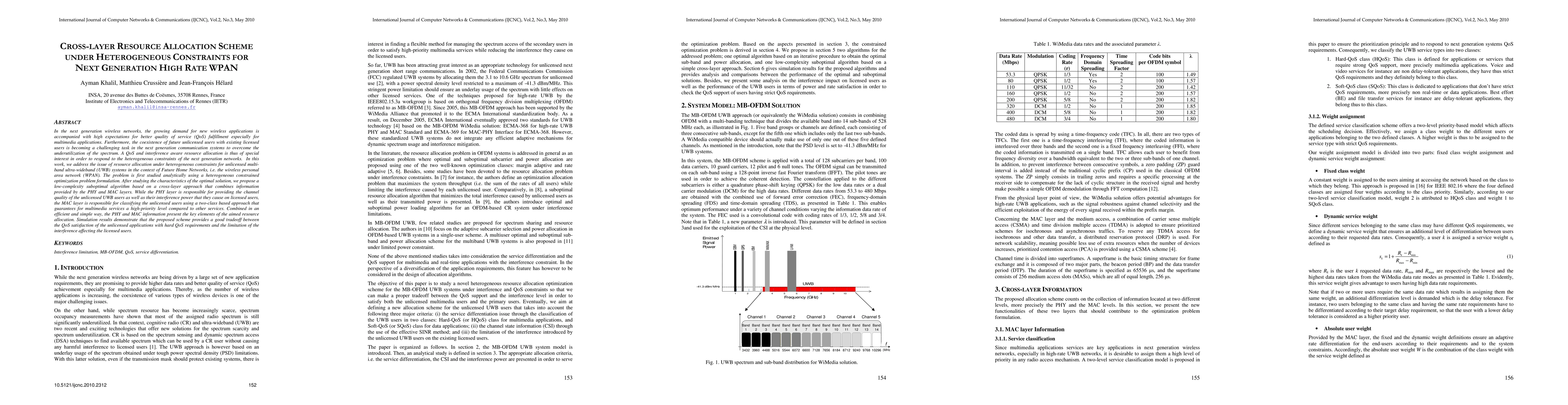 In the next generation wireless networks, the growing demand for new wireless applications is accompanied with high expectations for better quality of service (QoS) fulfillment especially for multimedia applications. Furthermore, the coexistence of future unlicensed users with existing licensed users is becoming a challenging task in the next generation communication systems to overcome the underutilization of the spectrum. A QoS and interference aware resource allocation is thus of special interest in order to respond to the heterogeneous constraints of the next generation networks. In this work, we address the issue of resource allocation under heterogeneous constraints for unlicensed multiband ultra-wideband (UWB) systems in the context of Future Home Networks, i.e. the wireless personal area network (WPAN). The problem is first studied analytically using a heterogeneous constrained optimization problem formulation. After studying the characteristics of the optimal solution, we propose a low-complexity suboptimal algorithm based on a cross-layer approach that combines information provided by the PHY and MAC layers. While the PHY layer is responsible for providing the channel quality of the unlicensed UWB users as well as their interference power that they cause on licensed users, the MAC layer is responsible for classifying the unlicensed users using a two-class based approach that guarantees for multimedia services a high-priority level compared to other services. Combined in an efficient and simple way, the PHY and MAC information present the key elements of the aimed resource allocation. Simulation results demonstrate that the proposed scheme provides a good tradeoff between the QoS satisfaction of the unlicensed applications with hard QoS requirements and the limitation of the interference affecting the licensed users.
