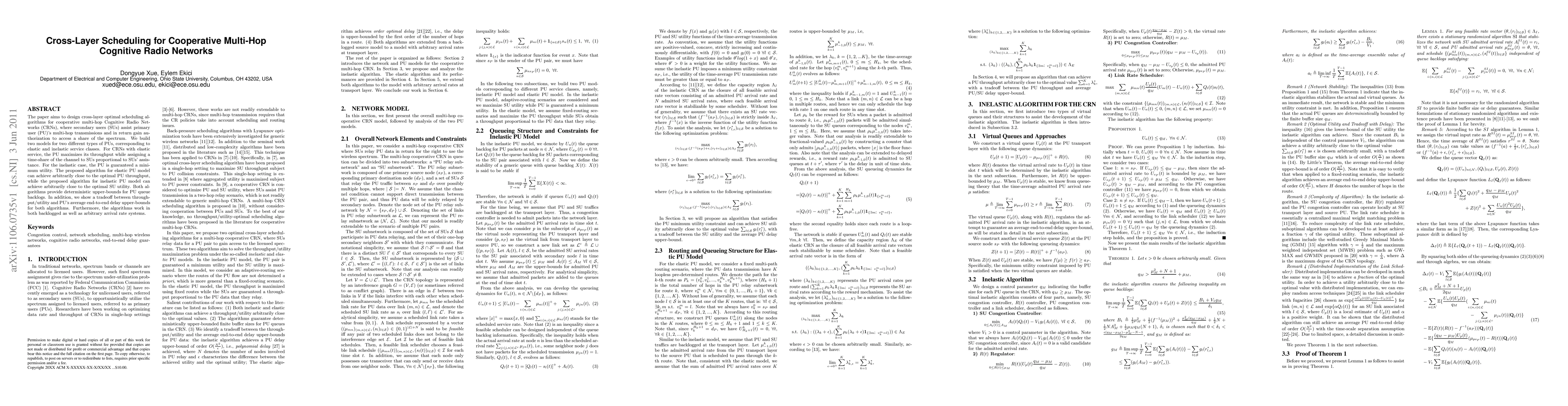 This paper proposes cross-layer scheduling algorithms for cooperative multi-hop Cognitive Radio Networks, optimizing throughput for elastic PUs and ensuring minimum utility for inelastic PUs. Both algorithms achieve near-optimal performance and provide upper-bounds for PU queue backlogs, demonstrating a tradeoff between throughput/utility and PU delay.