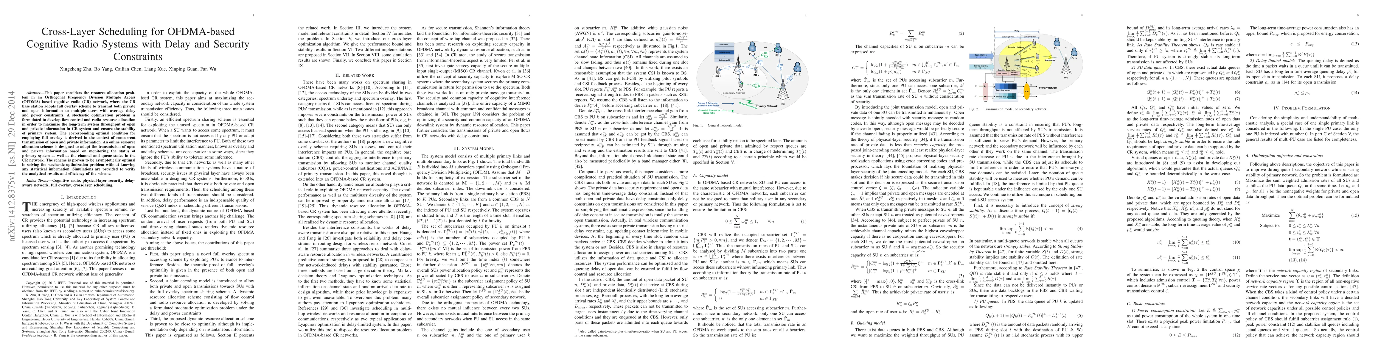 This paper proposes a cross-layer scheduling scheme for OFDMA-based cognitive radio networks to maximize throughput while ensuring delay and security constraints, employing an online resource allocation strategy that adapts to primary system status and channel conditions. The scheme is shown to be asymptotically optimal and is verified through simulations.