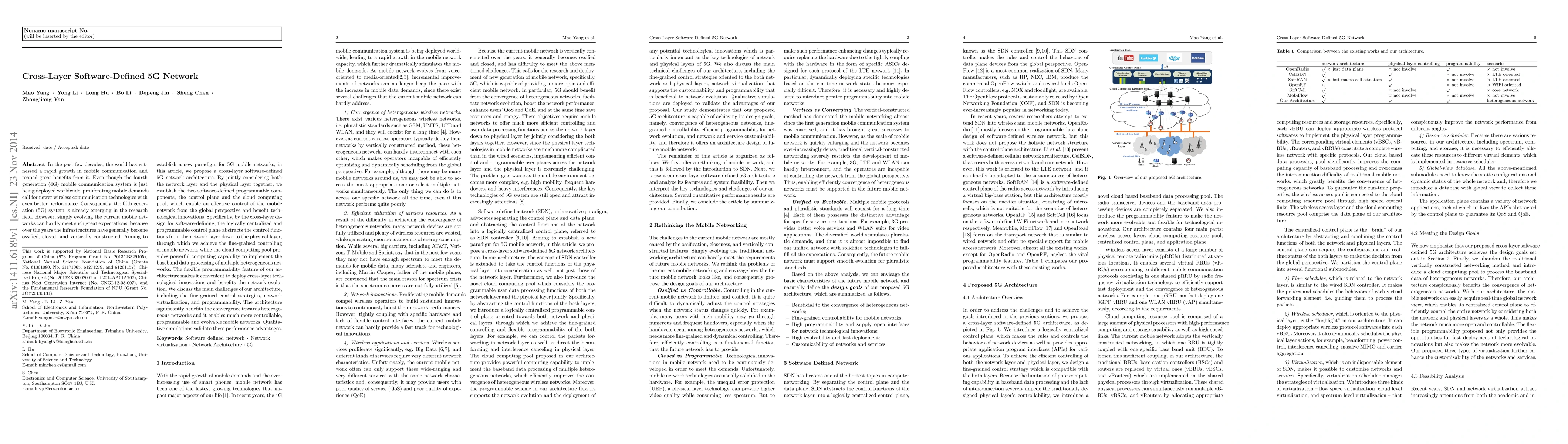 This paper proposes a cross-layer software-defined 5G network architecture that integrates control and physical layers to achieve fine-grained network management and computing capabilities. The architecture aims to enhance controllability, programmability, and evolvability for next-generation mobile networks.