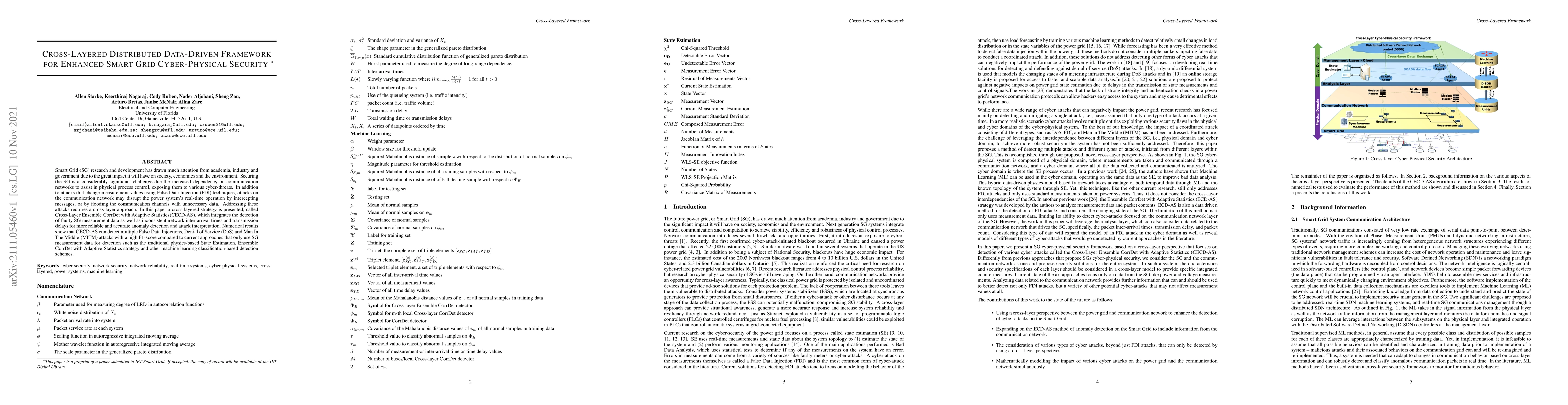 This paper proposes a cross-layered distributed data-driven framework called CECD-AS for enhancing smart grid cyber-physical security. It integrates detection of faulty SG measurement data and network anomalies for improved anomaly detection, successfully identifying multiple cyber-attacks with higher accuracy than traditional methods.