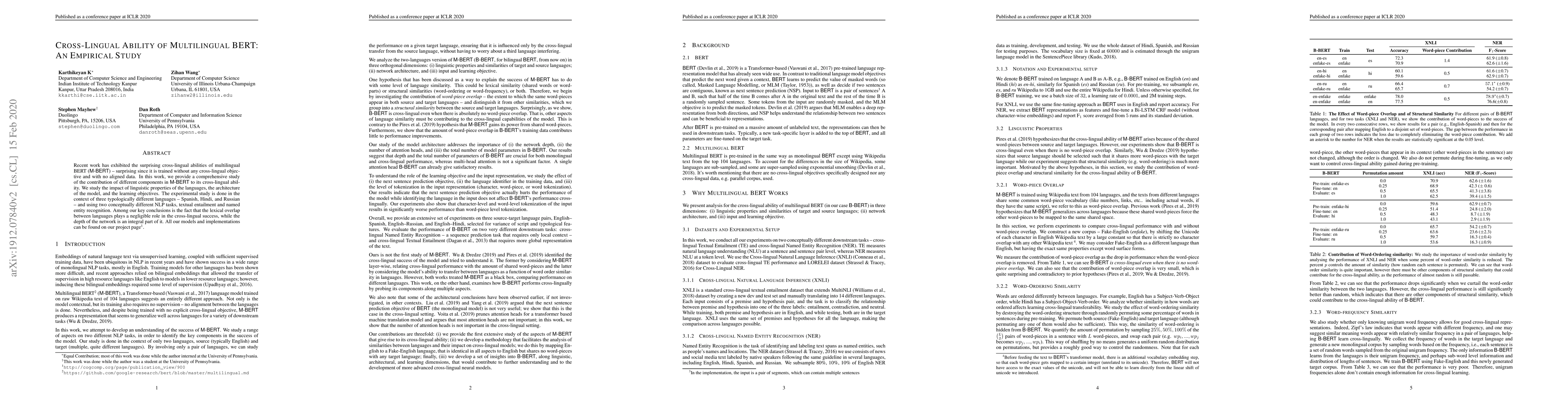 Recent work has exhibited the surprising cross-lingual abilities of multilingual BERT (M-BERT) -- surprising since it is trained without any cross-lingual objective and with no aligned data. In this work, we provide a comprehensive study of the contribution of different components in M-BERT to its cross-lingual ability. We study the impact of linguistic properties of the languages, the architecture of the model, and the learning objectives. The experimental study is done in the context of three typologically different languages -- Spanish, Hindi, and Russian -- and using two conceptually different NLP tasks, textual entailment and named entity recognition. Among our key conclusions is the fact that the lexical overlap between languages plays a negligible role in the cross-lingual success, while the depth of the network is an integral part of it. All our models and implementations can be found on our project page: http://cogcomp.org/page/publication_view/900 .