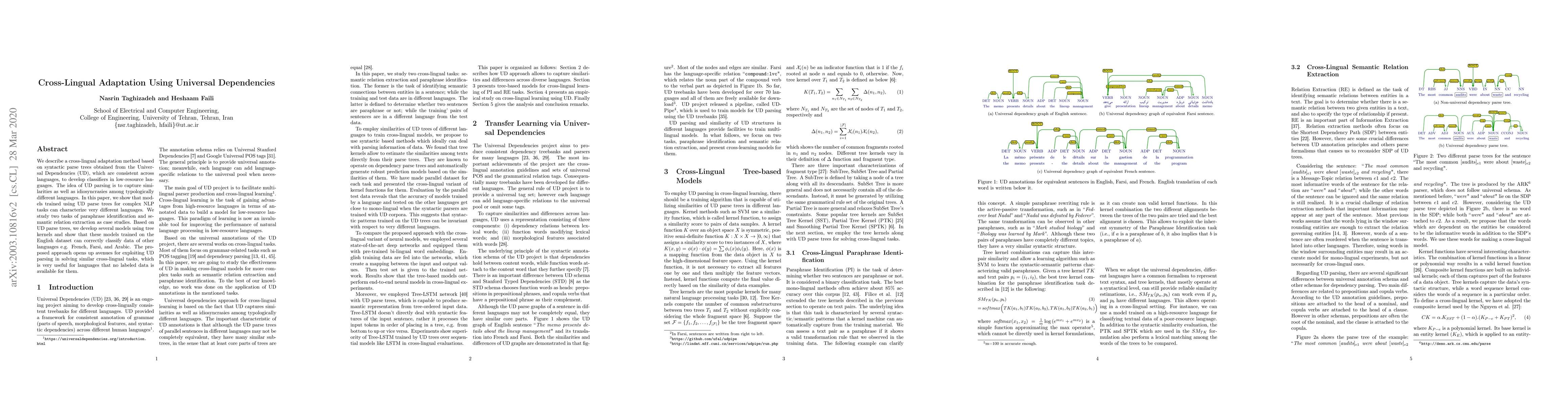 We describe a cross-lingual adaptation method based on syntactic parse trees obtained from the Universal Dependencies (UD), which are consistent across languages, to develop classifiers in low-resource languages. The idea of UD parsing is to capture similarities as well as idiosyncrasies among typologically different languages. In this paper, we show that models trained using UD parse trees for complex NLP tasks can characterize very different languages. We study two tasks of paraphrase identification and semantic relation extraction as case studies. Based on UD parse trees, we develop several models using tree kernels and show that these models trained on the English dataset can correctly classify data of other languages e.g. French, Farsi, and Arabic. The proposed approach opens up avenues for exploiting UD parsing in solving similar cross-lingual tasks, which is very useful for languages that no labeled data is available for them.