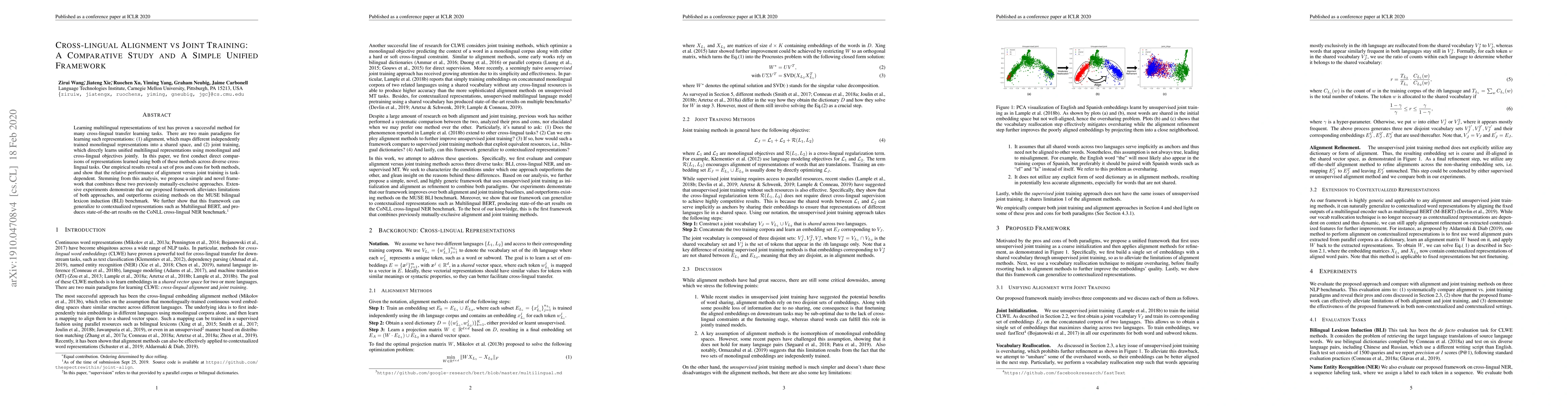 This paper compares two approaches to learning multilingual representations of text: cross-lingual alignment and joint training, showing that a novel combined framework outperforms existing methods on key benchmarks.
