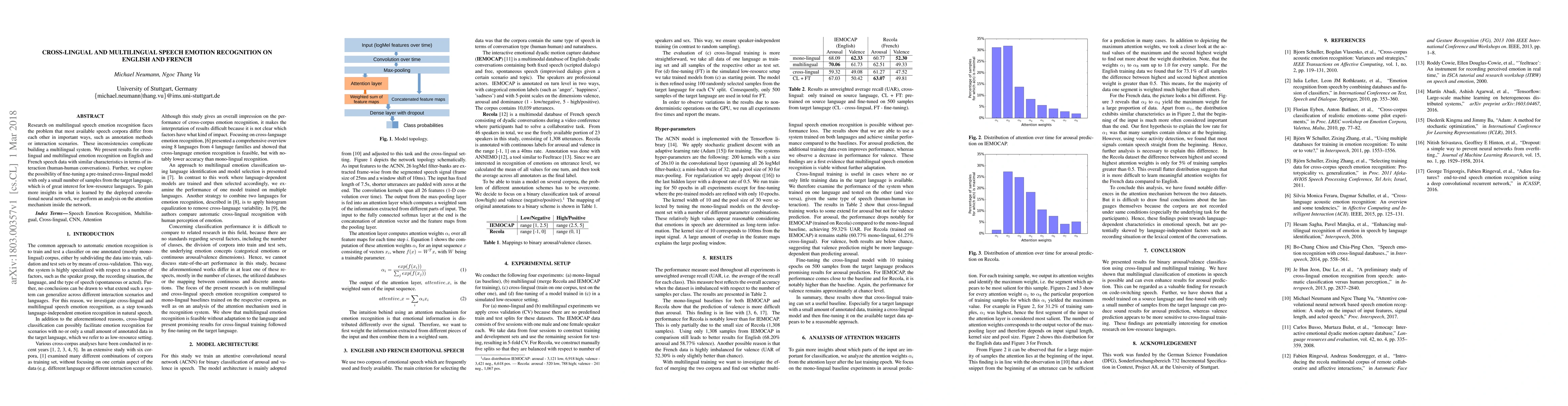 Research on multilingual speech emotion recognition faces the problem that most available speech corpora differ from each other in important ways, such as annotation methods or interaction scenarios. These inconsistencies complicate building a multilingual system. We present results for cross-lingual and multilingual emotion recognition on English and French speech data with similar characteristics in terms of interaction (human-human conversations). Further, we explore the possibility of fine-tuning a pre-trained cross-lingual model with only a small number of samples from the target language, which is of great interest for low-resource languages. To gain more insights in what is learned by the deployed convolutional neural network, we perform an analysis on the attention mechanism inside the network.