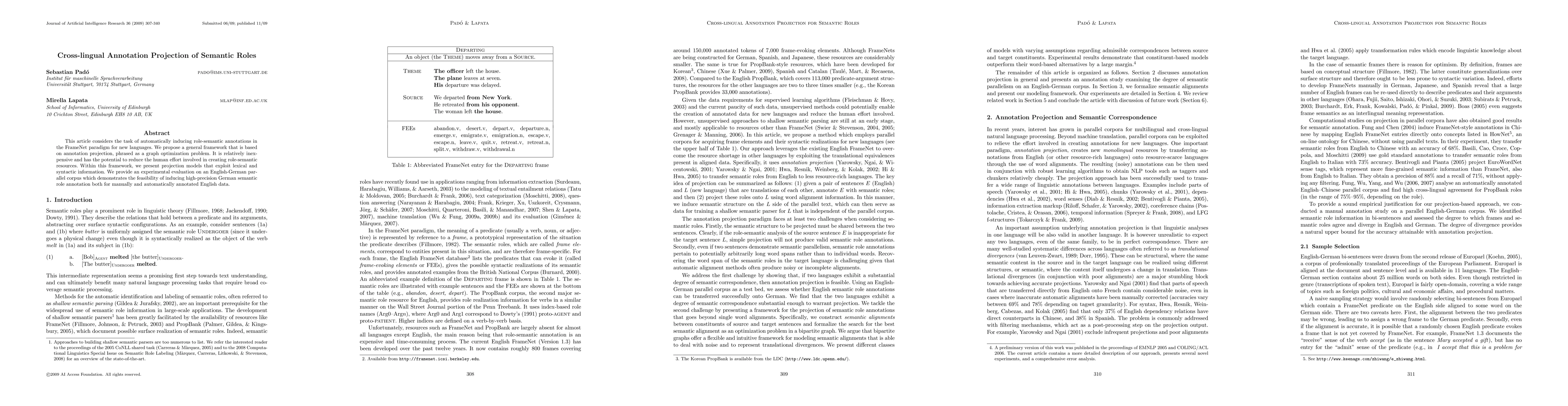This paper proposes a framework for automatically inducing semantic role annotations in new languages using annotation projection, demonstrating its feasibility through an English-German parallel corpus evaluation. The approach leverages lexical and syntactic information to achieve high-precision German semantic role annotations.