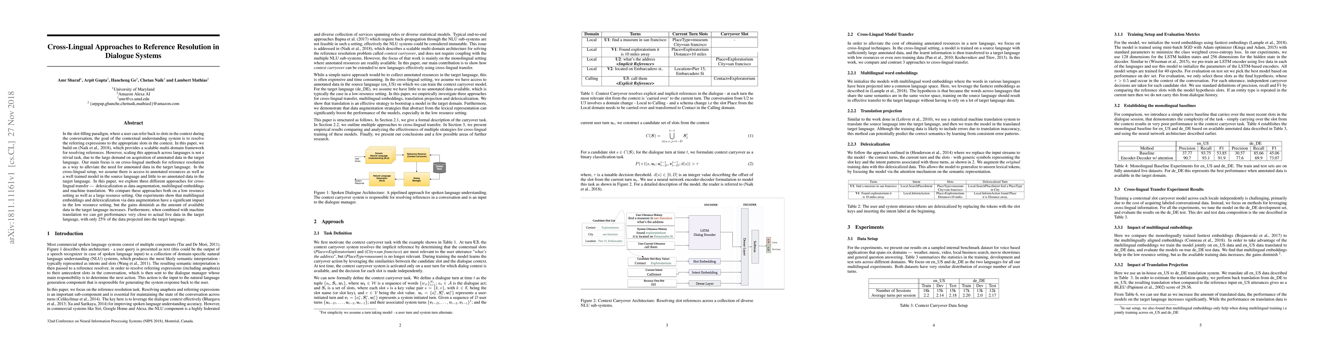 This paper explores cross-lingual approaches to reference resolution in dialogue systems, finding that multilingual embeddings and data augmentation techniques can improve performance on low-resource languages, but gains diminish with more available data.