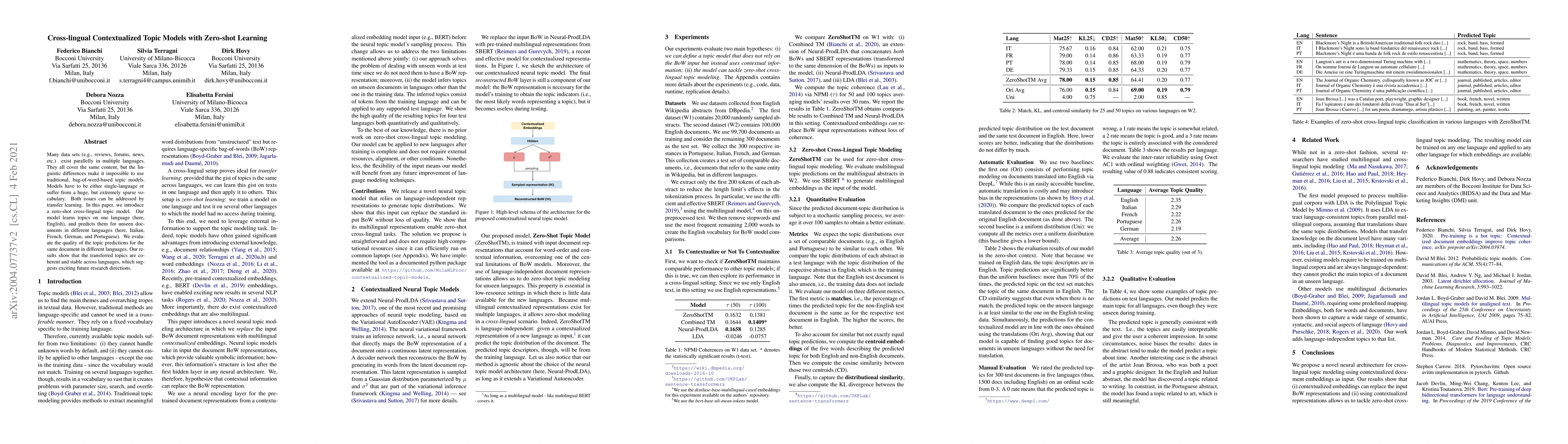 This paper proposes a zero-shot cross-lingual topic model that learns topics in one language (English) and predicts them for documents in other languages (Italian, French, German, and Portuguese). The results demonstrate coherent and stable topic predictions across languages, indicating potential for future research.