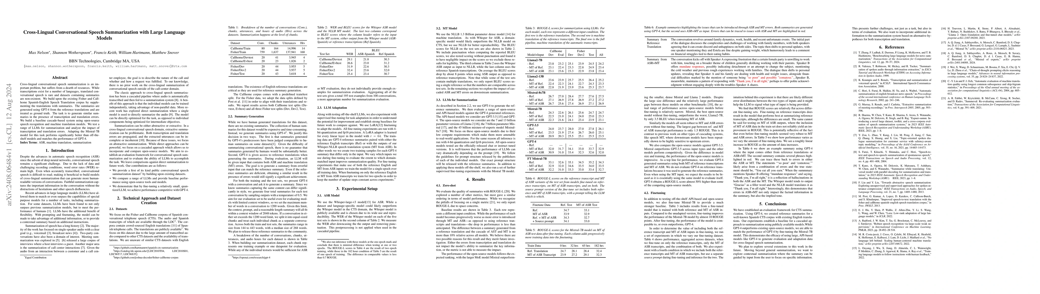 Cross-lingual conversational speech summarization is an important problem, but suffers from a dearth of resources. While transcriptions exist for a number of languages, translated conversational speech is rare and datasets containing summaries are non-existent. We build upon the existing Fisher and Callhome Spanish-English Speech Translation corpus by supplementing the translations with summaries. The summaries are generated using GPT-4 from the reference translations and are treated as ground truth. The task is to generate similar summaries in the presence of transcription and translation errors. We build a baseline cascade-based system using open-source speech recognition and machine translation models. We test a range of LLMs for summarization and analyze the impact of transcription and translation errors. Adapting the Mistral-7B model for this task performs significantly better than off-the-shelf models and matches the performance of GPT-4.