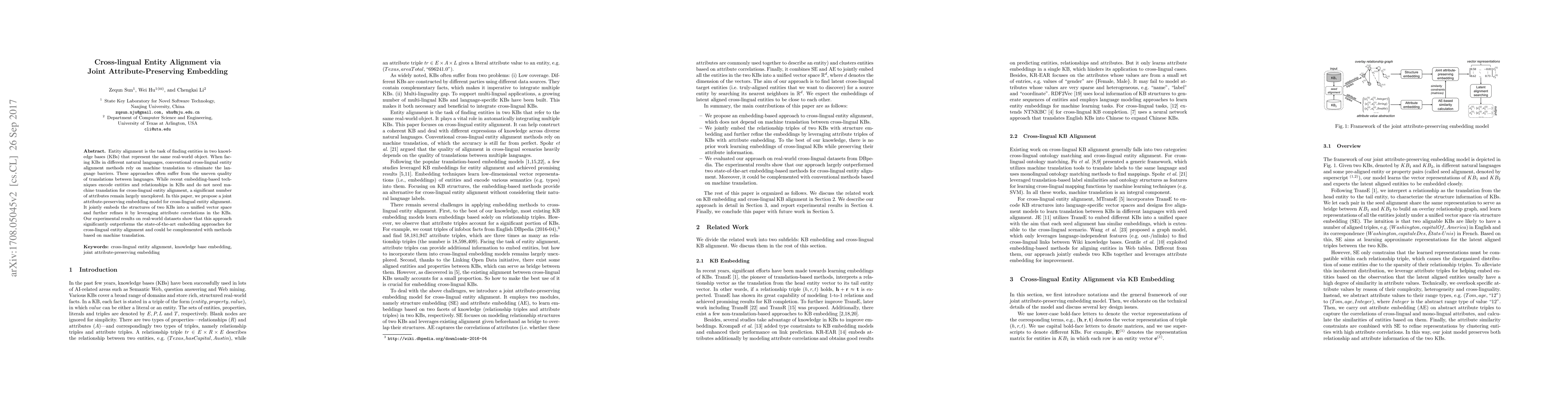 This paper proposes a joint attribute-preserving embedding model for cross-lingual entity alignment that embeds knowledge bases into a unified vector space, refining it by leveraging attribute correlations. Experimental results show it outperforms state-of-the-art methods and can complement machine translation-based approaches.