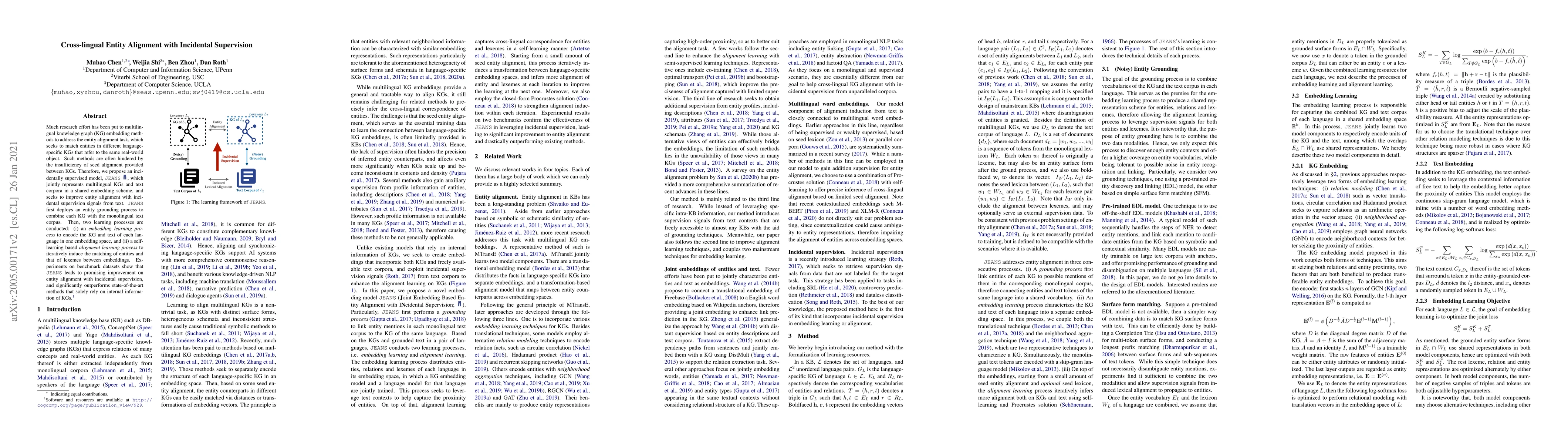 The paper proposes JEANS, an incidentally supervised model for cross-lingual entity alignment in multilingual knowledge graphs, which leverages text corpora to improve alignment through joint embedding learning and self-learning processes. Experimental results demonstrate JEANS's superior performance over existing methods.