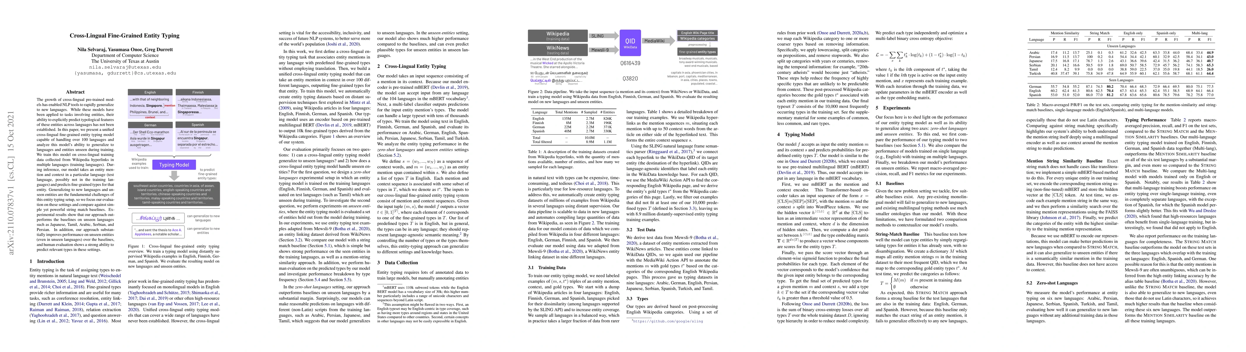 This paper introduces a cross-lingual fine-grained entity typing model that generalizes to over 100 languages, trained on Wikipedia hyperlinks. The model outperforms baselines in predicting typological features for entities in unseen languages and entities, demonstrating strong performance and relevance.