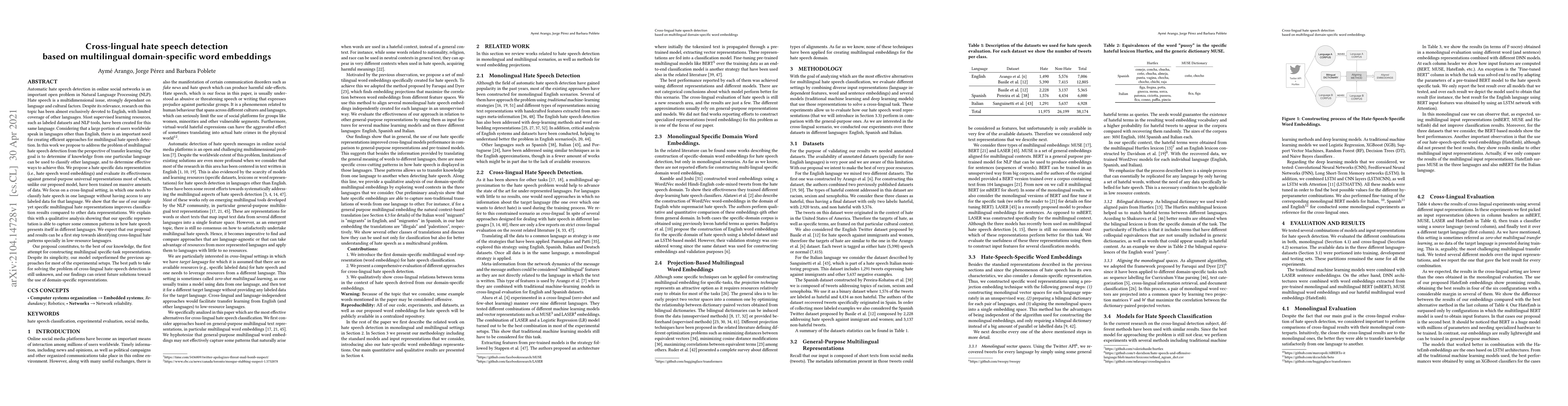 This paper proposes a novel approach for cross-lingual hate speech detection using multilingual domain-specific word embeddings, aiming to transfer knowledge from one language to another without labeled data in the target language. The study demonstrates that domain-specific representations outperform general-purpose universal embeddings, highlighting the effectiveness of capturing language-specific hate speech patterns.