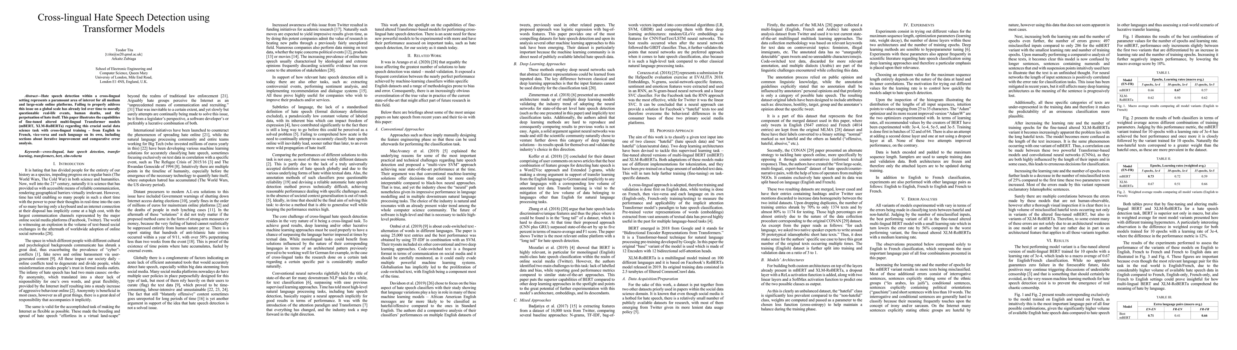 Hate speech detection within a cross-lingual setting represents a paramount area of interest for all medium and large-scale online platforms. Failing to properly address this issue on a global scale has already led over time to morally questionable real-life events, human deaths, and the perpetuation of hate itself. This paper illustrates the capabilities of fine-tuned altered multi-lingual Transformer models (mBERT, XLM-RoBERTa) regarding this crucial social data science task with cross-lingual training from English to French, vice-versa and each language on its own, including sections about iterative improvement and comparative error analysis.