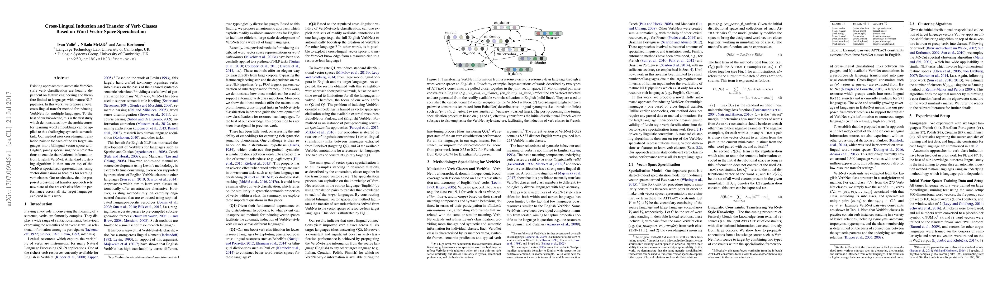 The research proposes a cross-lingual transfer method for inducing VerbNets for multiple languages using bilingual vector spaces with English, specializing representations to encode relational information from English VerbNet. A clustering algorithm is then applied to these specialized representations to classify verb classes.