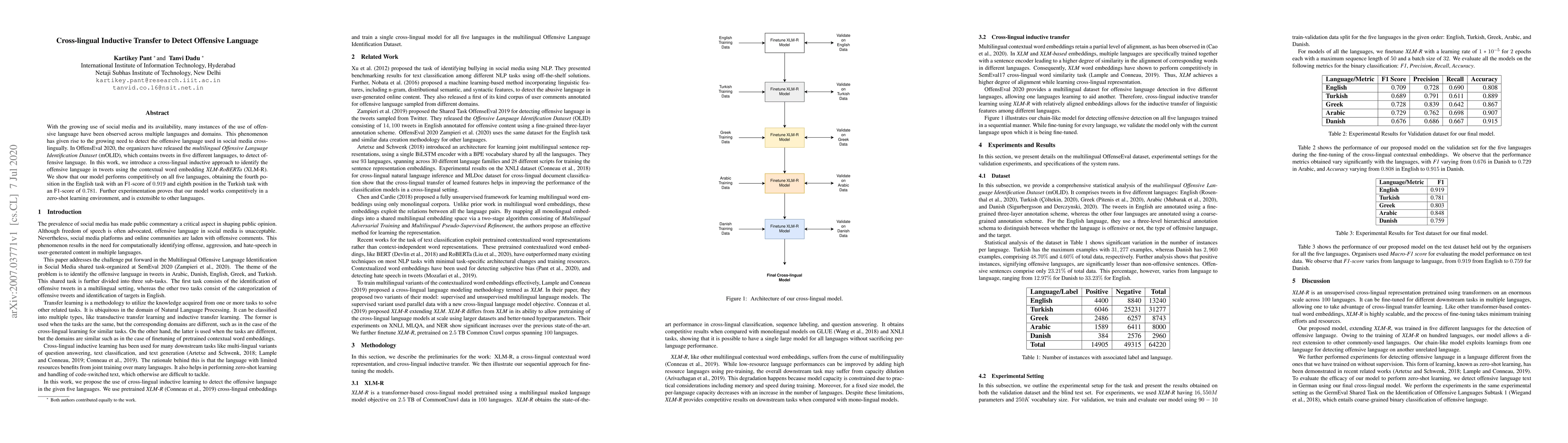 This research proposes a cross-lingual inductive transfer model using XLM-RoBERTa to detect offensive language in social media tweets across five languages, achieving competitive results on the mOLID dataset and demonstrating potential for zero-shot learning and language extensibility.