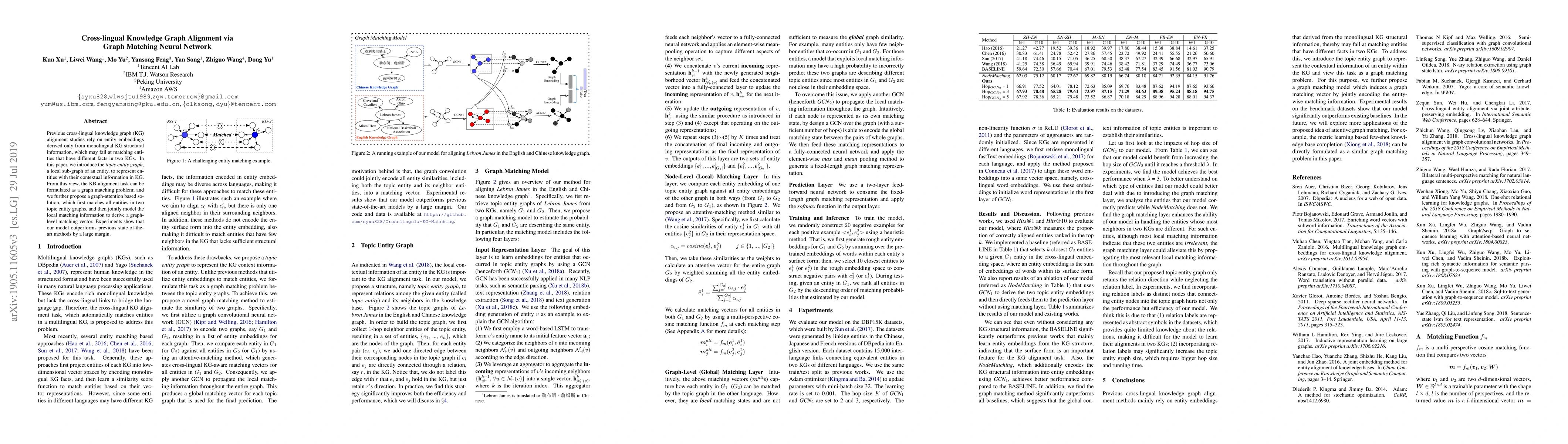 This paper proposes a graph matching neural network for cross-lingual knowledge graph alignment using topic entity graphs to represent entities with contextual information. The model outperforms previous state-of-the-art methods by matching local subgraphs and deriving a graph-level matching vector.
