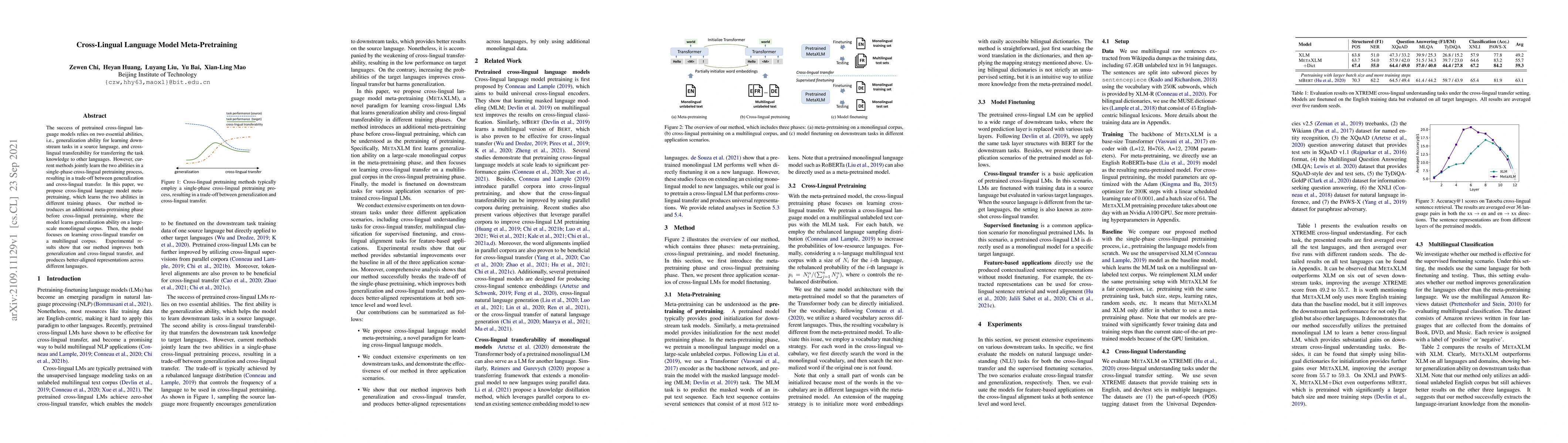 The paper proposes a cross-lingual language model meta-pretraining method that separates the learning of generalization and cross-lingual transfer into distinct training phases, showing improved performance and better representation alignment across languages compared to single-phase pretraining.