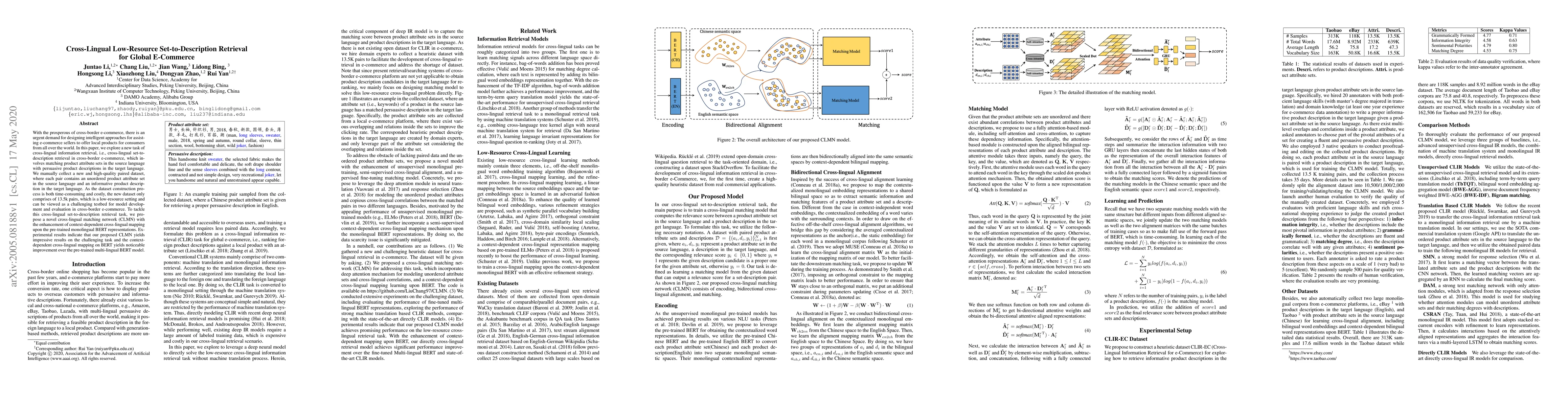 This paper introduces a novel cross-lingual set-to-description retrieval task for global e-commerce, proposing a cross-lingual matching network (CLMN) enhanced with context-dependent cross-lingual mapping on BERT. The study demonstrates significant improvements over pre-trained multi-lingual BERT models, highlighting the effectiveness of the approach in a low-resource setting.