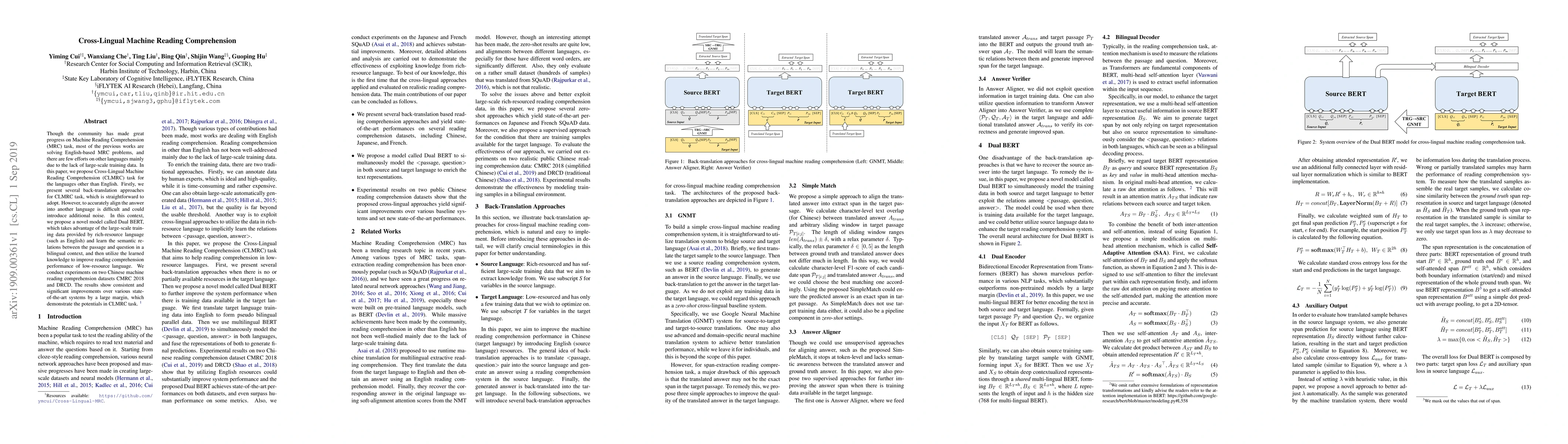 This paper introduces the Cross-Lingual Machine Reading Comprehension (CLMRC) task for non-English languages, proposing back-translation approaches and a novel Dual BERT model to align answers across languages, demonstrating significant improvements on Chinese datasets.