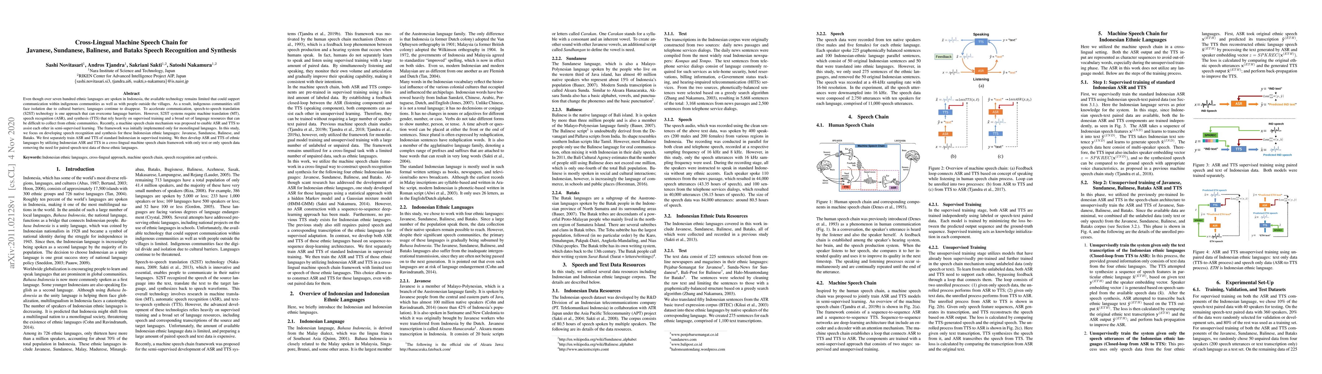 Even though over seven hundred ethnic languages are spoken in Indonesia, the available technology remains limited that could support communication within indigenous communities as well as with people outside the villages. As a result, indigenous communities still face isolation due to cultural barriers; languages continue to disappear. To accelerate communication, speech-to-speech translation (S2ST) technology is one approach that can overcome language barriers. However, S2ST systems require machine translation (MT), speech recognition (ASR), and synthesis (TTS) that rely heavily on supervised training and a broad set of language resources that can be difficult to collect from ethnic communities. Recently, a machine speech chain mechanism was proposed to enable ASR and TTS to assist each other in semi-supervised learning. The framework was initially implemented only for monolingual languages. In this study, we focus on developing speech recognition and synthesis for these Indonesian ethnic languages: Javanese, Sundanese, Balinese, and Bataks. We first separately train ASR and TTS of standard Indonesian in supervised training. We then develop ASR and TTS of ethnic languages by utilizing Indonesian ASR and TTS in a cross-lingual machine speech chain framework with only text or only speech data removing the need for paired speech-text data of those ethnic languages.