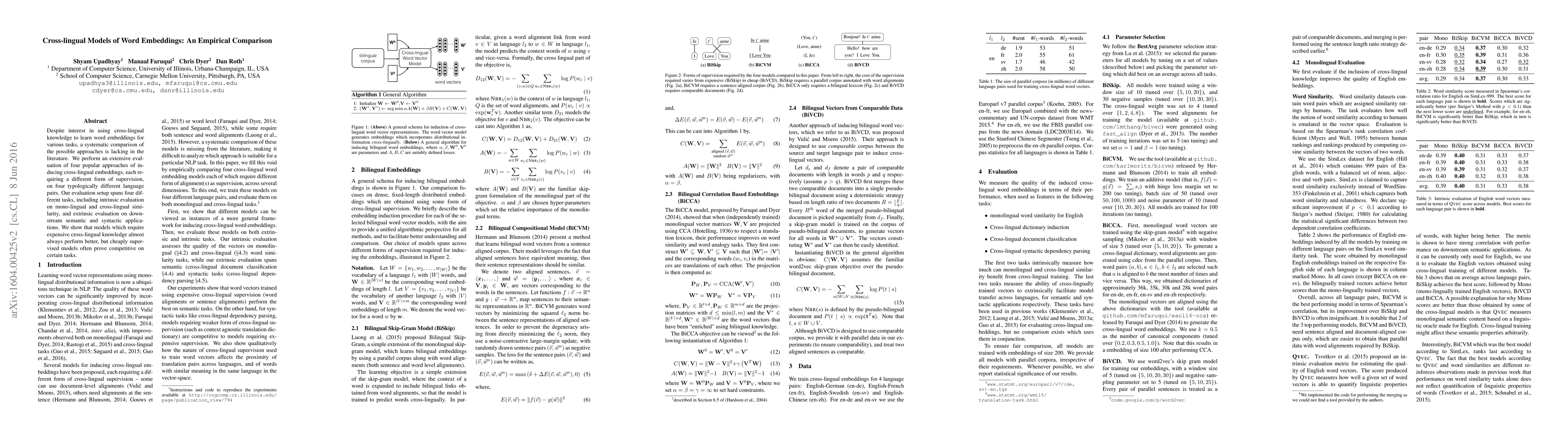 Despite interest in using cross-lingual knowledge to learn word embeddings for various tasks, a systematic comparison of the possible approaches is lacking in the literature. We perform an extensive evaluation of four popular approaches of inducing cross-lingual embeddings, each requiring a different form of supervision, on four typographically different language pairs. Our evaluation setup spans four different tasks, including intrinsic evaluation on mono-lingual and cross-lingual similarity, and extrinsic evaluation on downstream semantic and syntactic applications. We show that models which require expensive cross-lingual knowledge almost always perform better, but cheaply supervised models often prove competitive on certain tasks.
