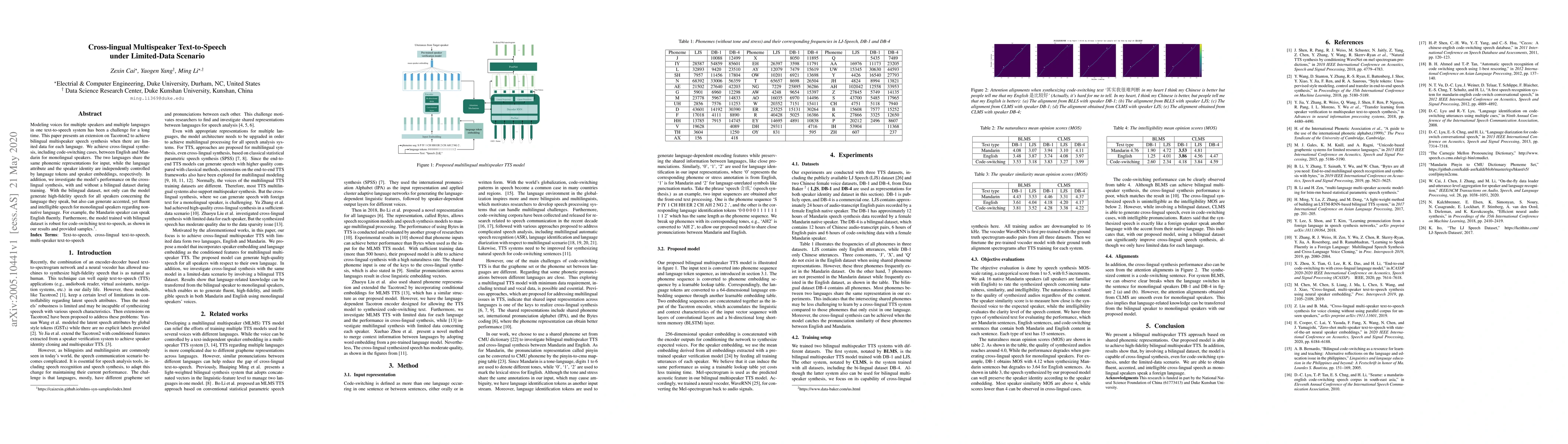 Modeling voices for multiple speakers and multiple languages in one text-to-speech system has been a challenge for a long time. This paper presents an extension on Tacotron2 to achieve bilingual multispeaker speech synthesis when there are limited data for each language. We achieve cross-lingual synthesis, including code-switching cases, between English and Mandarin for monolingual speakers. The two languages share the same phonemic representations for input, while the language attribute and the speaker identity are independently controlled by language tokens and speaker embeddings, respectively. In addition, we investigate the model's performance on the cross-lingual synthesis, with and without a bilingual dataset during training. With the bilingual dataset, not only can the model generate high-fidelity speech for all speakers concerning the language they speak, but also can generate accented, yet fluent and intelligible speech for monolingual speakers regarding non-native language. For example, the Mandarin speaker can speak English fluently. Furthermore, the model trained with bilingual dataset is robust for code-switching text-to-speech, as shown in our results and provided samples.{https://caizexin.github.io/mlms-syn-samples/index.html}.