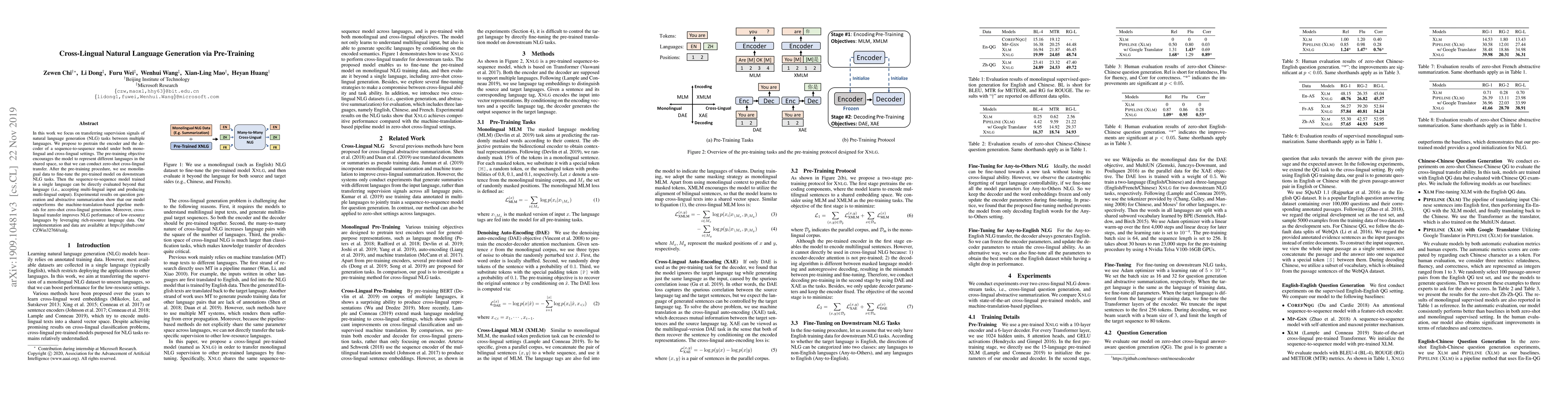 This paper proposes a method to enhance cross-lingual natural language generation (NLG) by pre-training a sequence-to-sequence model under both monolingual and cross-lingual settings. The pre-trained model demonstrates superior zero-shot cross-lingual generation capabilities, outperforming traditional machine-translation-based methods.
