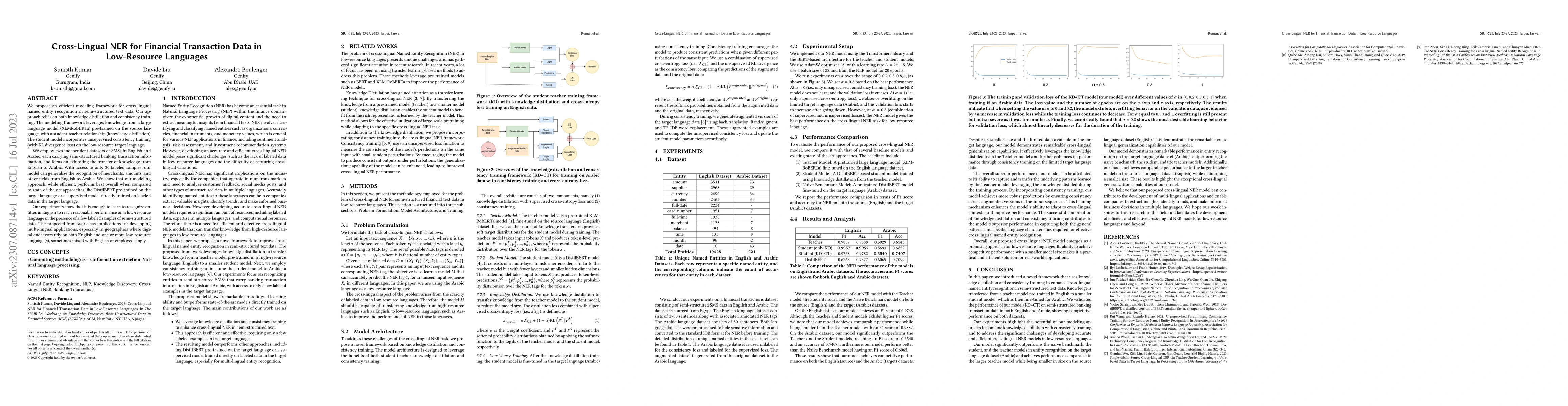 This paper proposes a cross-lingual named entity recognition framework for financial transaction data in low-resource languages, utilizing knowledge distillation and consistency training. The model, trained on a large language model, achieves high performance with minimal labeled data, demonstrating its potential for multi-lingual applications in regions where English and low-resource languages coexist.