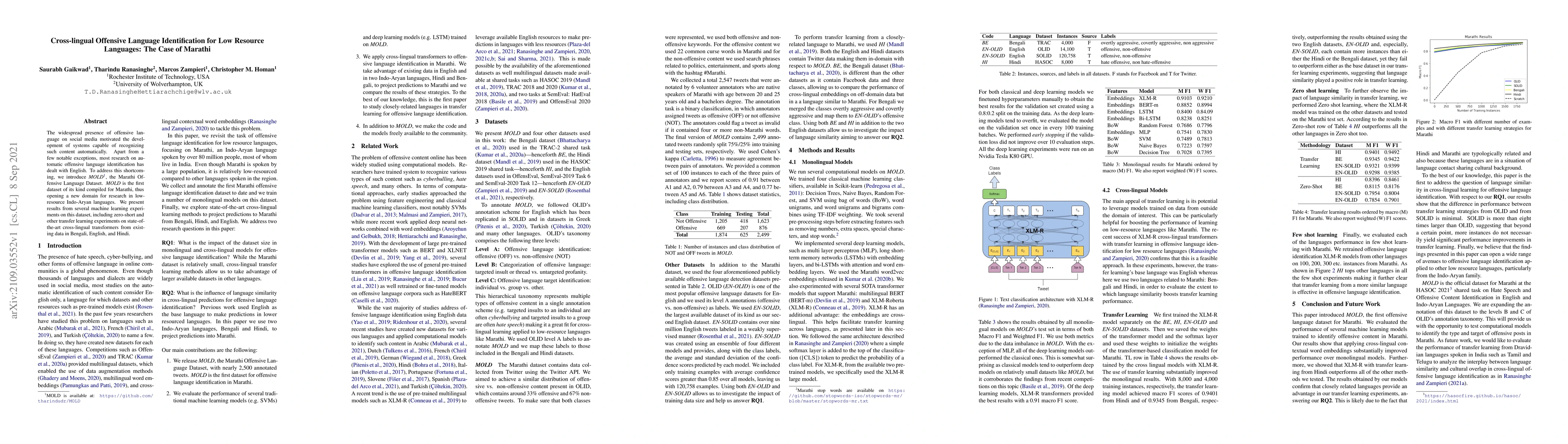 Title: Cross-lingual Offensive Language Identification for Low Resource Languages: The Case of Marathi Summary: This paper introduces MOLD, the first dataset for identifying offensive language in Marathi, and explores its use in machine learning experiments utilizing cross-lingual transfer learning from other Indo-Aryan languages.