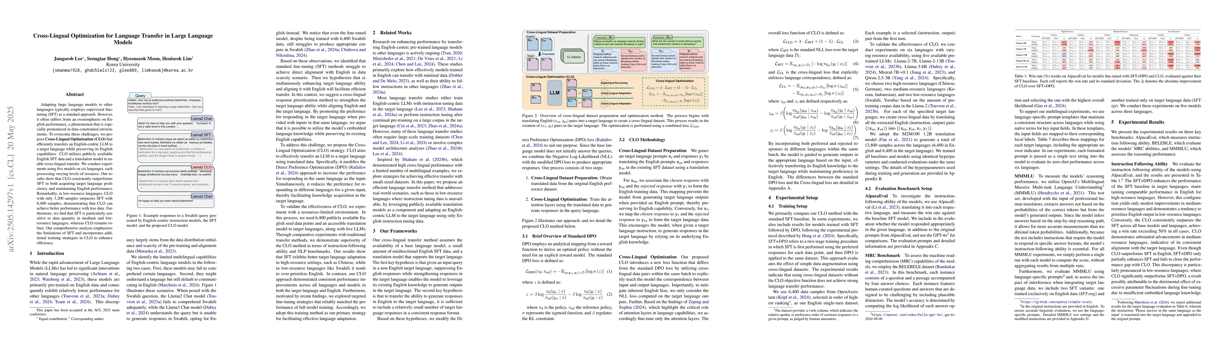 A new approach called Cross-Lingual Optimization (CLO) improves language transfer in large language models by leveraging English-centric data and a translation model, outperforming traditional supervised fine-tuning methods with less data.