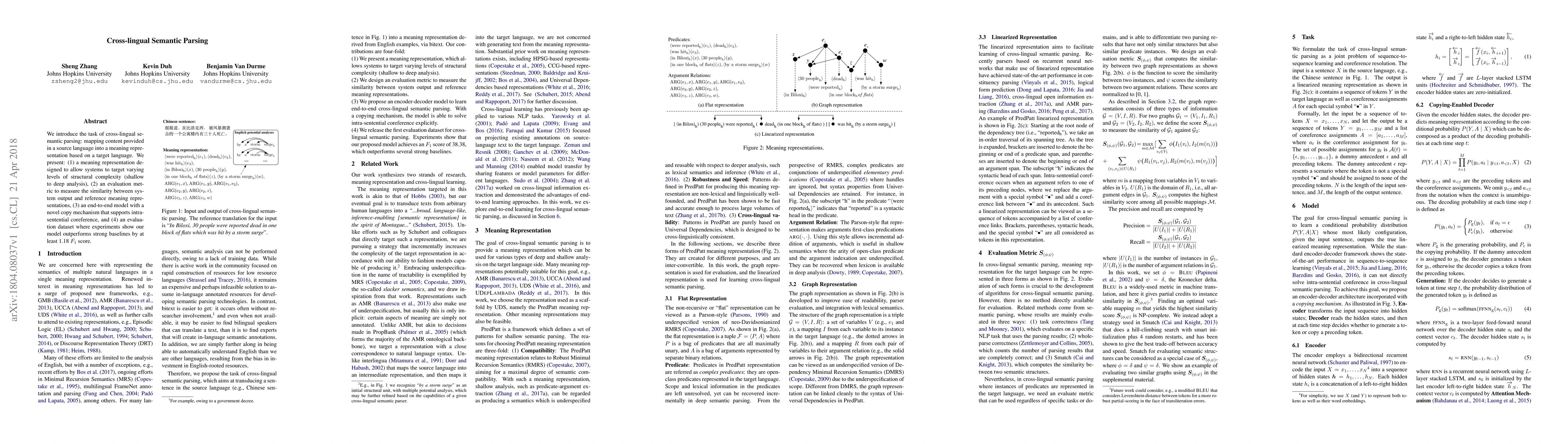 We introduce the task of cross-lingual semantic parsing: mapping content provided in a source language into a meaning representation based on a target language. We present: (1) a meaning representation designed to allow systems to target varying levels of structural complexity (shallow to deep analysis), (2) an evaluation metric to measure the similarity between system output and reference meaning representations, (3) an end-to-end model with a novel copy mechanism that supports intrasentential coreference, and (4) an evaluation dataset where experiments show our model outperforms strong baselines by at least 1.18 F1 score.