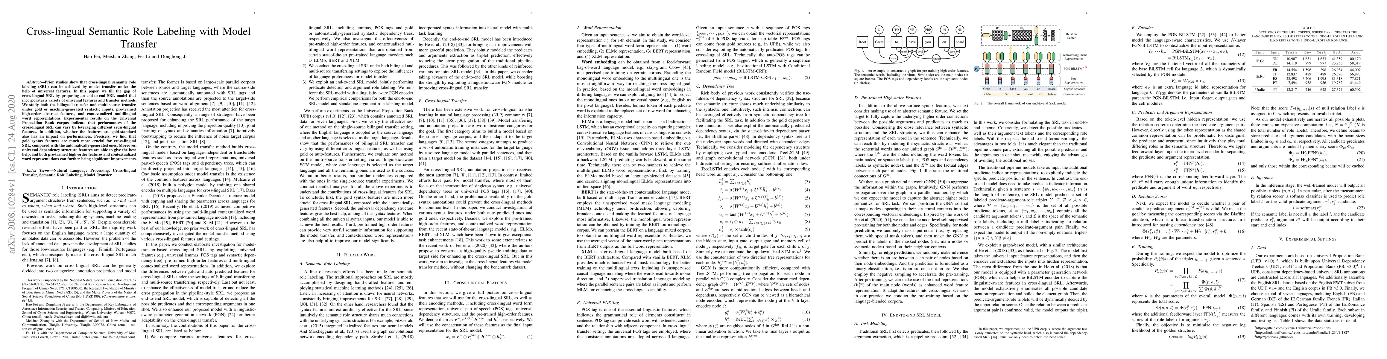 This paper proposes an end-to-end model for cross-lingual semantic role labeling (SRL) that leverages various universal features and transfer methods. Experimental results demonstrate that gold-standard syntactic features significantly improve performance over machine-generated ones, with universal dependency structures providing the best results, supplemented by pre-trained high-order features and contextualized word representations.