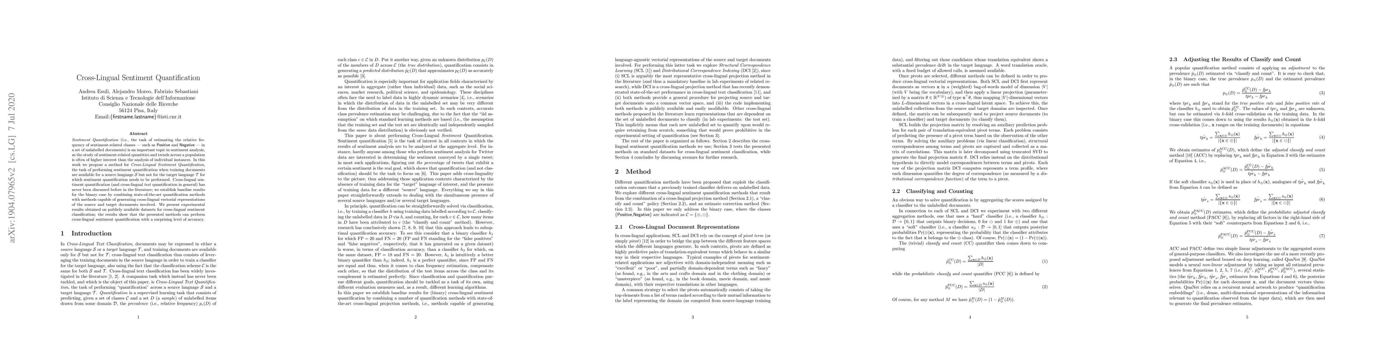 This paper proposes a novel method for cross-lingual sentiment quantification, enabling the estimation of sentiment classes in a target language without corresponding training data, by combining state-of-the-art quantification techniques with cross-lingual vector representations. Experimental results demonstrate the method's effectiveness across multiple datasets.
