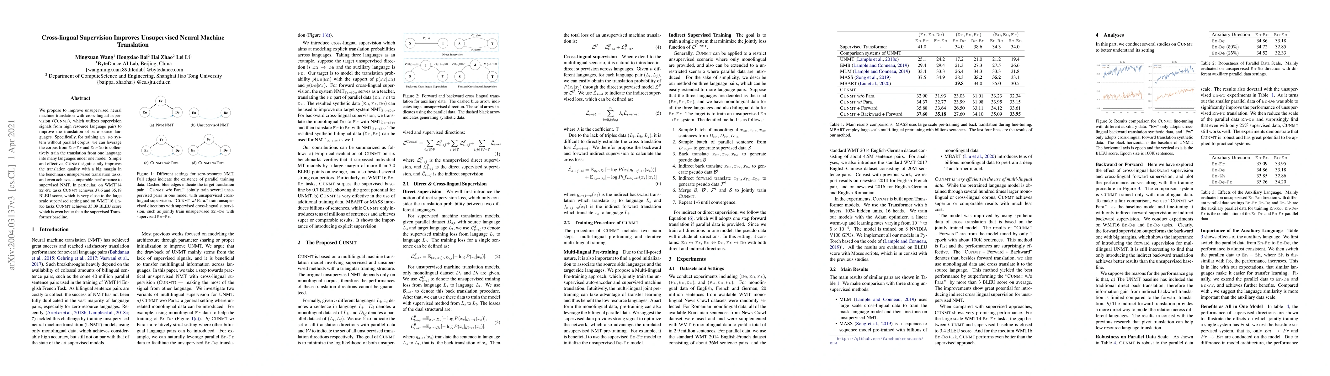 Title: Cross-lingual Supervision Improves Unsupervised Neural Machine Translation Summary: This paper proposes a multilingual unsupervised neural machine translation framework that leverages information from high-resource language pairs to enhance zero-resource language translations, achieving over 3 BLEU score improvements on benchmark datasets.