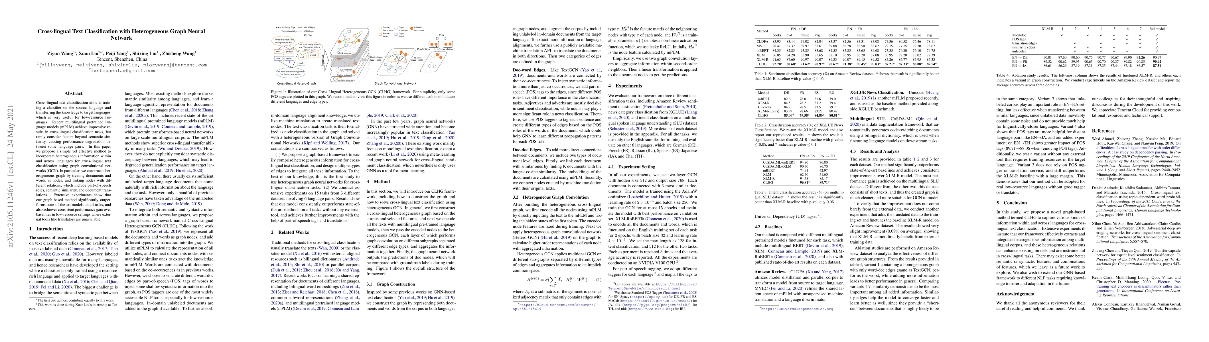 This paper proposes a graph neural network approach for cross-lingual text classification that incorporates heterogeneous information such as part-of-speech roles and semantic similarity. The method outperforms state-of-the-art models and shows consistent gains in low-resource language settings.