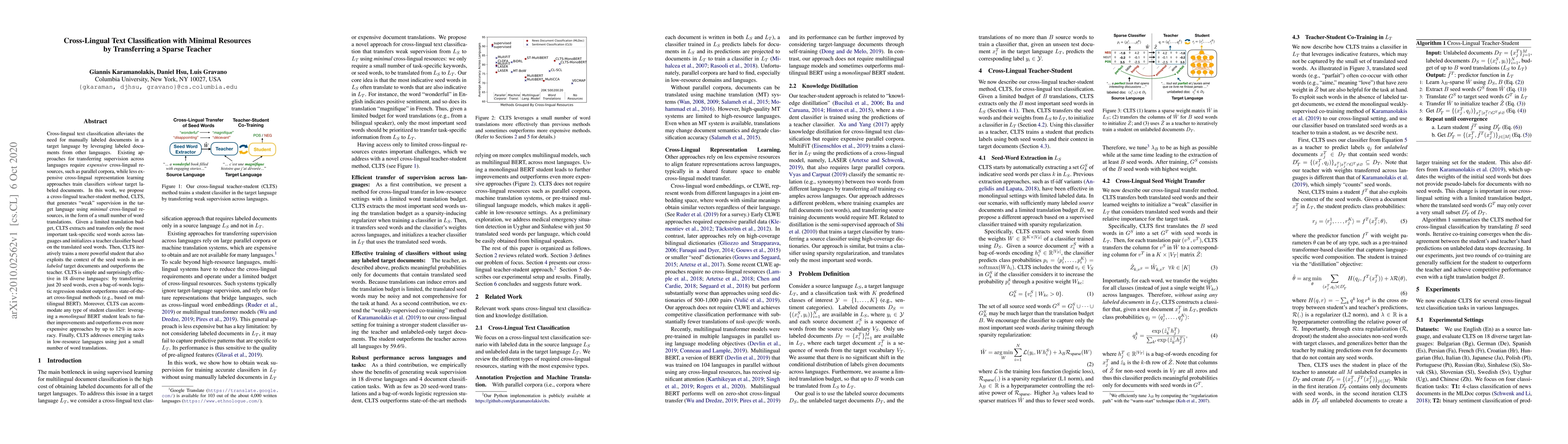 The paper introduces CLTS, a cross-lingual text classification method that leverages minimal resources by transferring a sparse teacher model using just 20 seed word translations, achieving state-of-the-art performance even against more resource-intensive methods. CLTS can utilize any student classifier, including monolingual BERT, for further accuracy improvements.