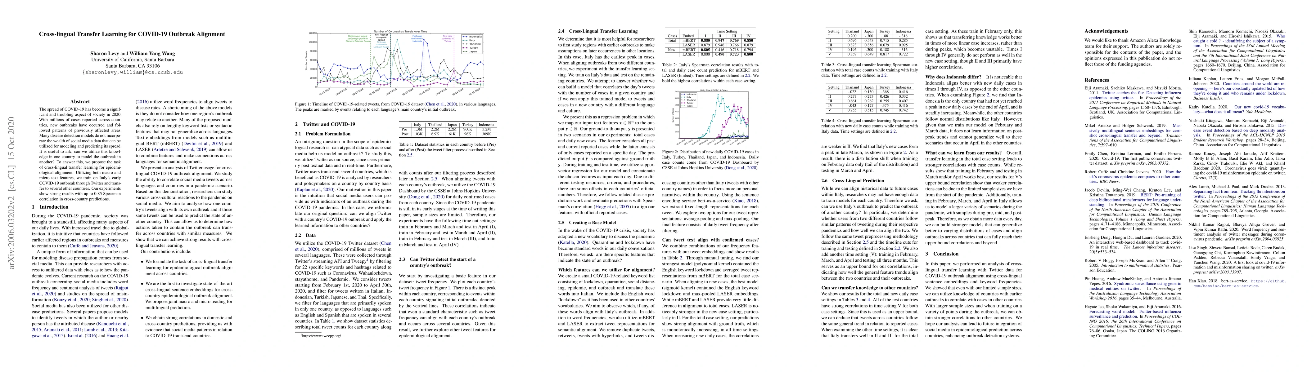 The spread of COVID-19 has become a significant and troubling aspect of society in 2020. With millions of cases reported across countries, new outbreaks have occurred and followed patterns of previously affected areas. Many disease detection models do not incorporate the wealth of social media data that can be utilized for modeling and predicting its spread. In this case, it is useful to ask, can we utilize this knowledge in one country to model the outbreak in another? To answer this, we propose the task of cross-lingual transfer learning for epidemiological alignment. Utilizing both macro and micro text features, we train on Italy's early COVID-19 outbreak through Twitter and transfer to several other countries. Our experiments show strong results with up to 0.85 Spearman correlation in cross-country predictions.