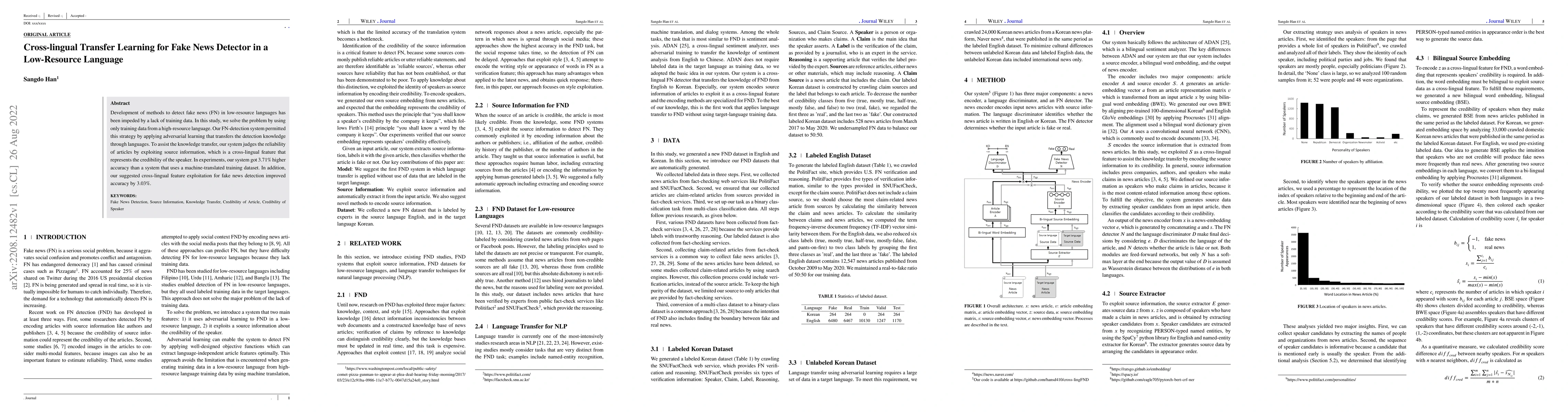 This paper proposes a cross-lingual transfer learning method for detecting fake news in low-resource languages using high-resource language training data, achieving 3.71% higher accuracy than machine-translated training datasets. The system enhances accuracy by 3.03% through the use of cross-lingual features representing speaker credibility.