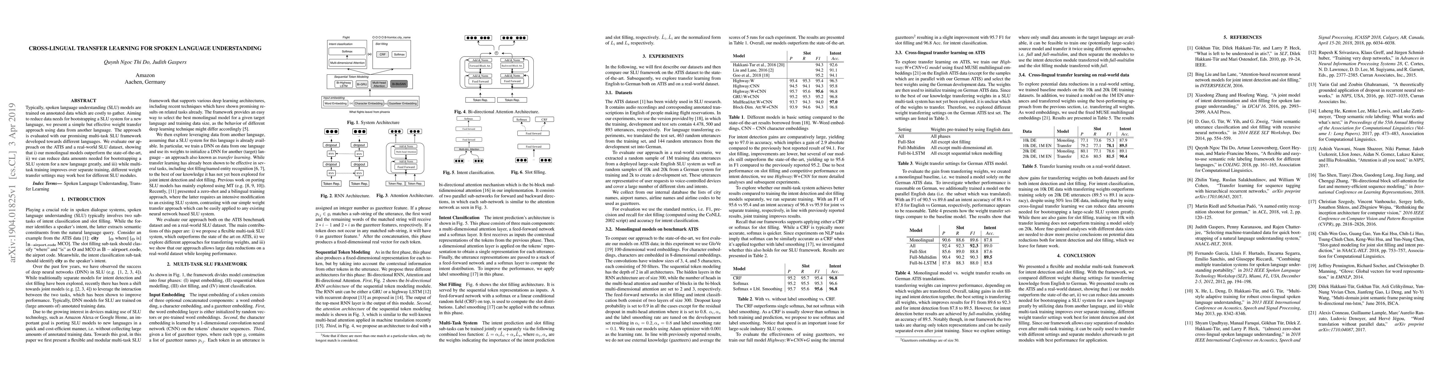 This paper proposes a weight transfer approach for cross-lingual spoken language understanding, demonstrating that it can significantly reduce data needs for bootstrapping a new language system. The method outperforms state-of-the-art monolingual models and shows that multitask training, with tailored weight transfer settings, can optimize performance for different SLU modules.