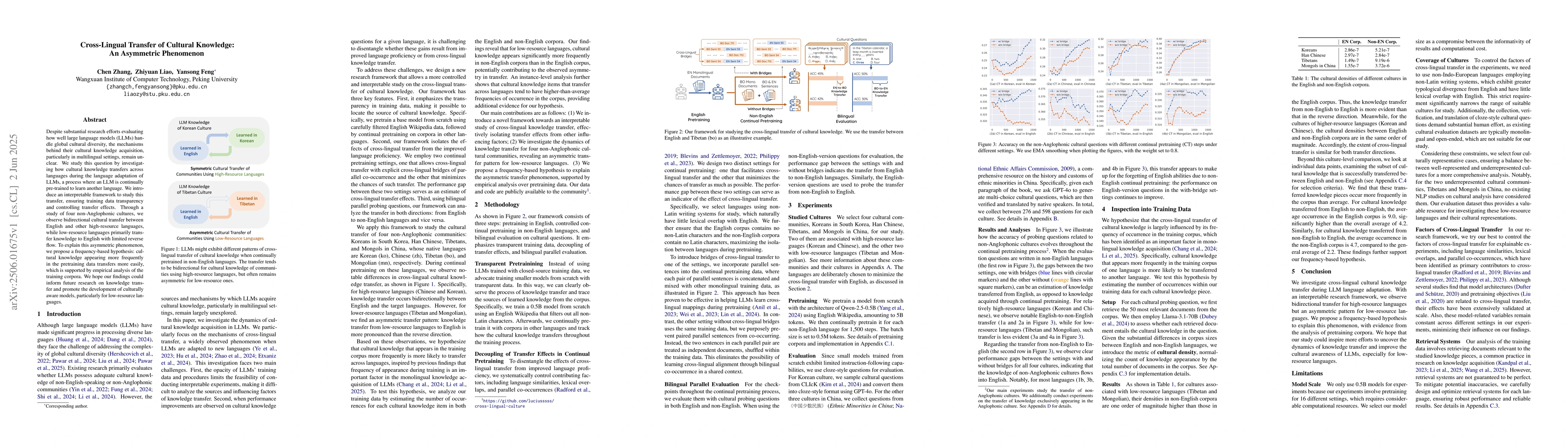 The research introduces a frequency-based hypothesis to explain the asymmetric cultural knowledge transfer phenomenon, supported by empirical analysis of training corpora.