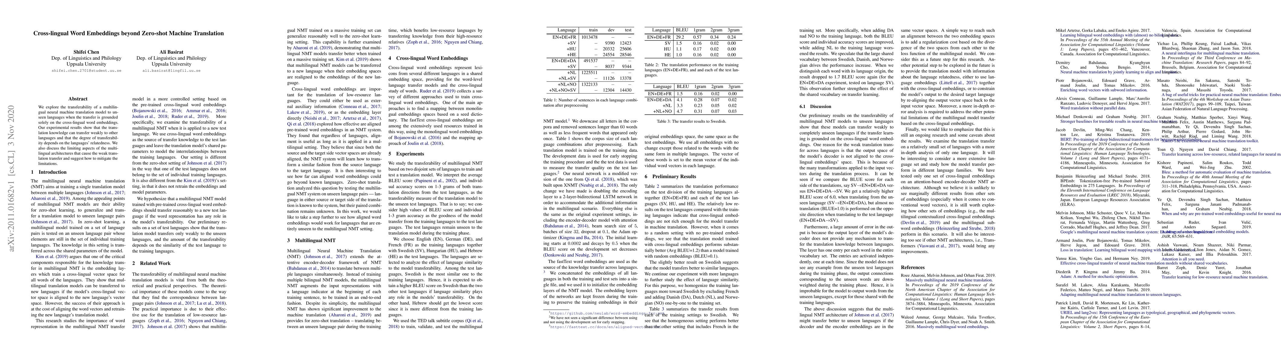 This paper investigates the transferability of multilingual neural machine translation models to unseen languages using cross-lingual word embeddings, finding that translation knowledge weakly transfers based on language relatedness, and discusses limitations and potential mitigation strategies for multilingual architectures.