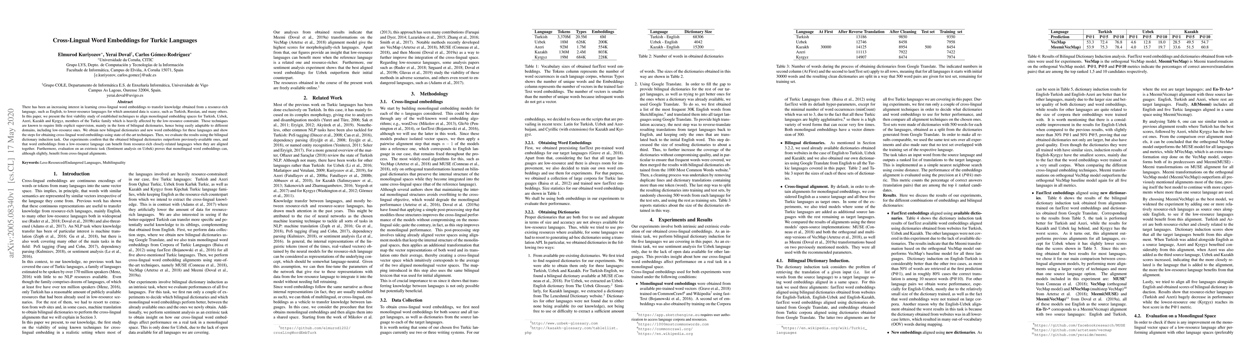 This study explores techniques to align monolingual word embeddings for five Turkic languages, showing that resource-rich languages can benefit lower-resource ones through cross-lingual embeddings. The results indicate improved bilingual dictionaries and slight enhancements in sentiment analysis tasks, suggesting the effectiveness of cross-lingual alignment.