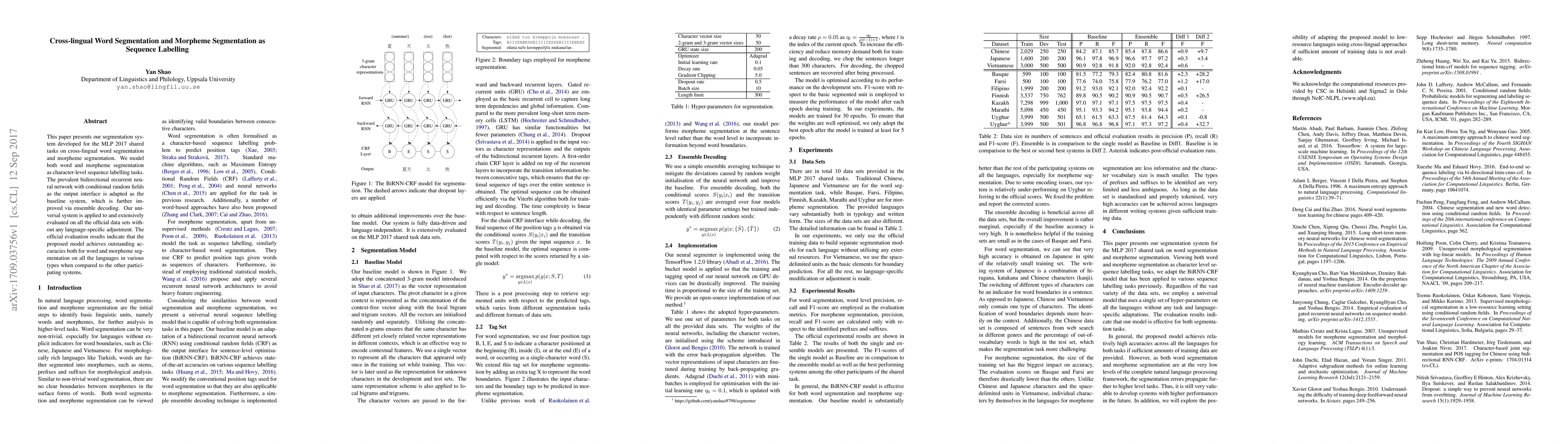 This paper presents our segmentation system developed for the MLP 2017 shared tasks on cross-lingual word segmentation and morpheme segmentation. We model both word and morpheme segmentation as character-level sequence labelling tasks. The prevalent bidirectional recurrent neural network with conditional random fields as the output interface is adapted as the baseline system, which is further improved via ensemble decoding. Our universal system is applied to and extensively evaluated on all the official data sets without any language-specific adjustment. The official evaluation results indicate that the proposed model achieves outstanding accuracies both for word and morpheme segmentation on all the languages in various types when compared to the other participating systems.