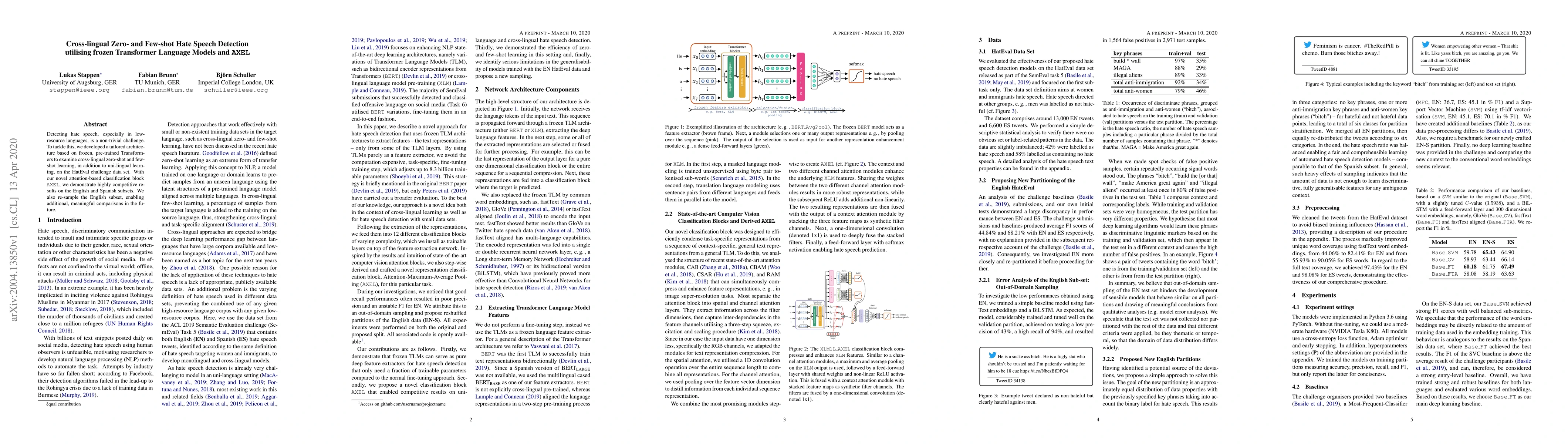 Detecting hate speech, especially in low-resource languages, is a non-trivial challenge. To tackle this, we developed a tailored architecture based on frozen, pre-trained Transformers to examine cross-lingual zero-shot and few-shot learning, in addition to uni-lingual learning, on the HatEval challenge data set. With our novel attention-based classification block AXEL, we demonstrate highly competitive results on the English and Spanish subsets. We also re-sample the English subset, enabling additional, meaningful comparisons in the future.