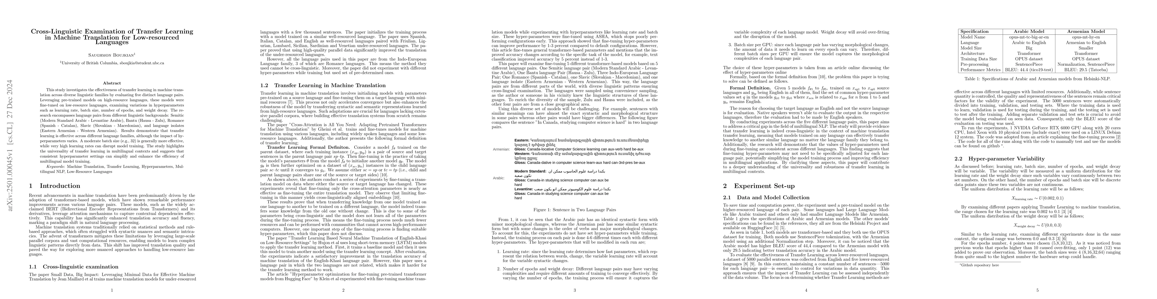 This study investigates the effectiveness of transfer learning in machine translation across diverse linguistic families by evaluating five distinct language pairs. Leveraging pre-trained models on high-resource languages, these models were fine-tuned on low-resource languages, examining variations in hyperparameters such as learning rate, batch size, number of epochs, and weight decay. The research encompasses language pairs from different linguistic backgrounds: Semitic (Modern Standard Arabic - Levantine Arabic), Bantu (Hausa - Zulu), Romance (Spanish - Catalan), Slavic (Slovakian - Macedonian), and language isolates (Eastern Armenian - Western Armenian). Results demonstrate that transfer learning is effective across different language families, although the impact of hyperparameters varies. A moderate batch size (e.g., 32) is generally more effective, while very high learning rates can disrupt model training. The study highlights the universality of transfer learning in multilingual contexts and suggests that consistent hyperparameter settings can simplify and enhance the efficiency of multilingual model training.