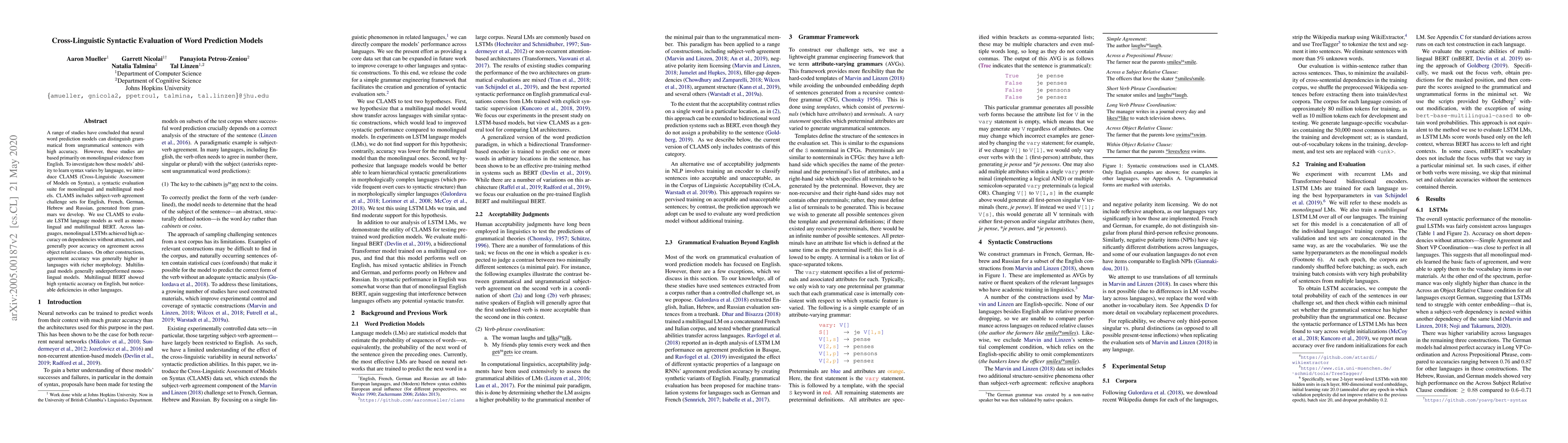 A study evaluates word prediction models' ability to learn syntax across languages, finding that monolingual LSTMs perform better than multilingual models, with accuracy varying by language's morphology richness.